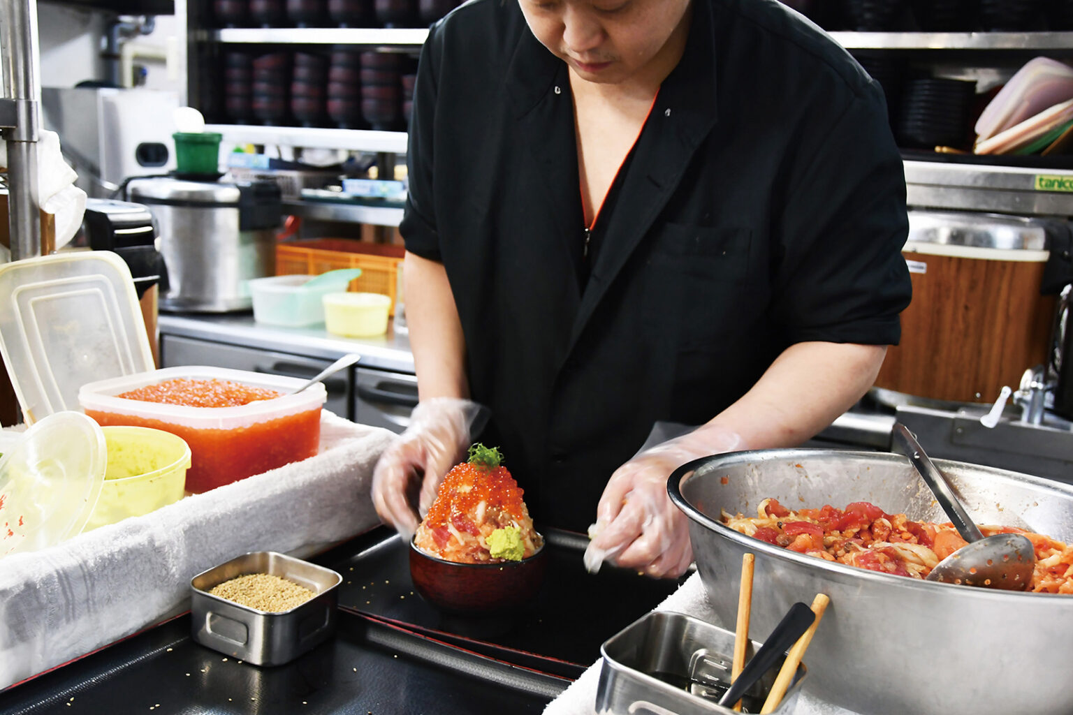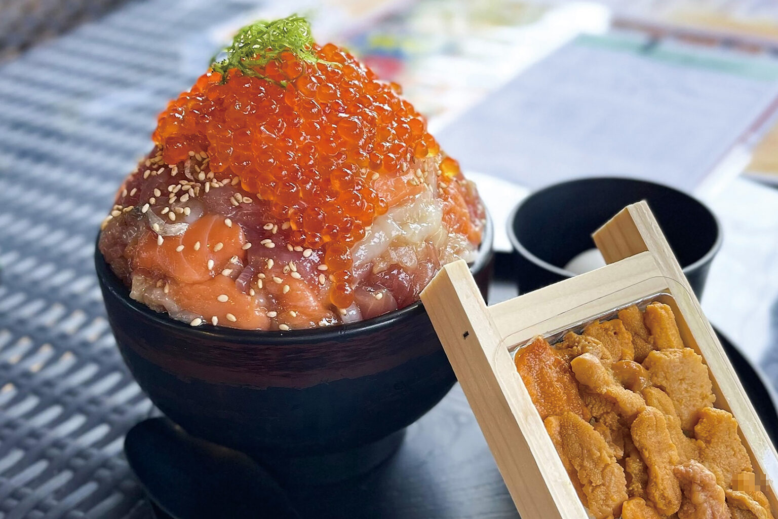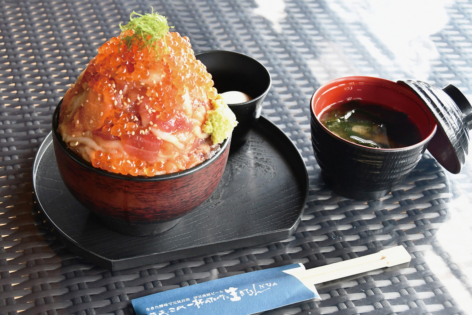 漁師町・伊東の食文化を継承した漁師めし「漁師の漬け丼御前」。漁師が船上で食べていた料理であり、地域を代表する郷土料理です。新鮮なマグロ、アジ、イカ、サーモン、イクラが450グラムも盛り付けられたボリューム満点の一品で、温玉を混ぜて食べるのもまた美味。伊東ならではの海の幸を存分に堪能できます。