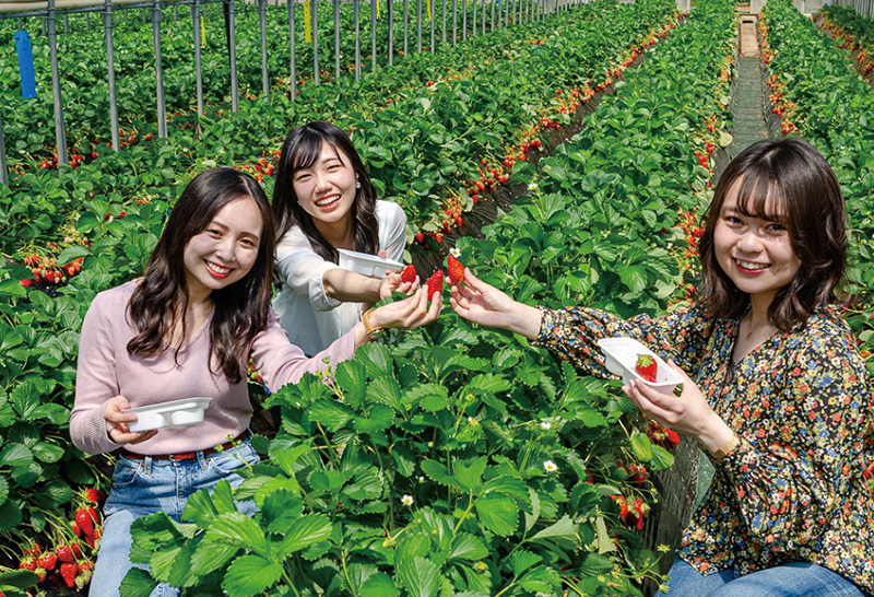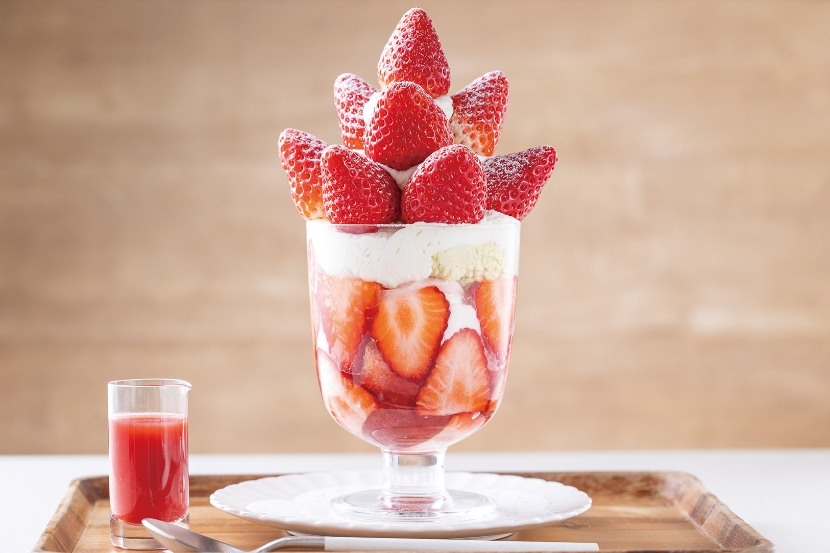 伊豆の国のイチゴシーズンは冬から春。甘さと酸味のバランスが良い「紅ほっぺ」、やわらかくて酸味が少なく甘みが強い「章姫」、光沢があり香りと甘み、みずみずしさが特徴の「きらぴ香」。静岡県産のこの3品種を主に栽培しています。ぜひ食べ比べを。さらにおすすめしたいのはイチゴスイーツ。名物「ボンボンパフェ」で幸せ気分を味わってください。