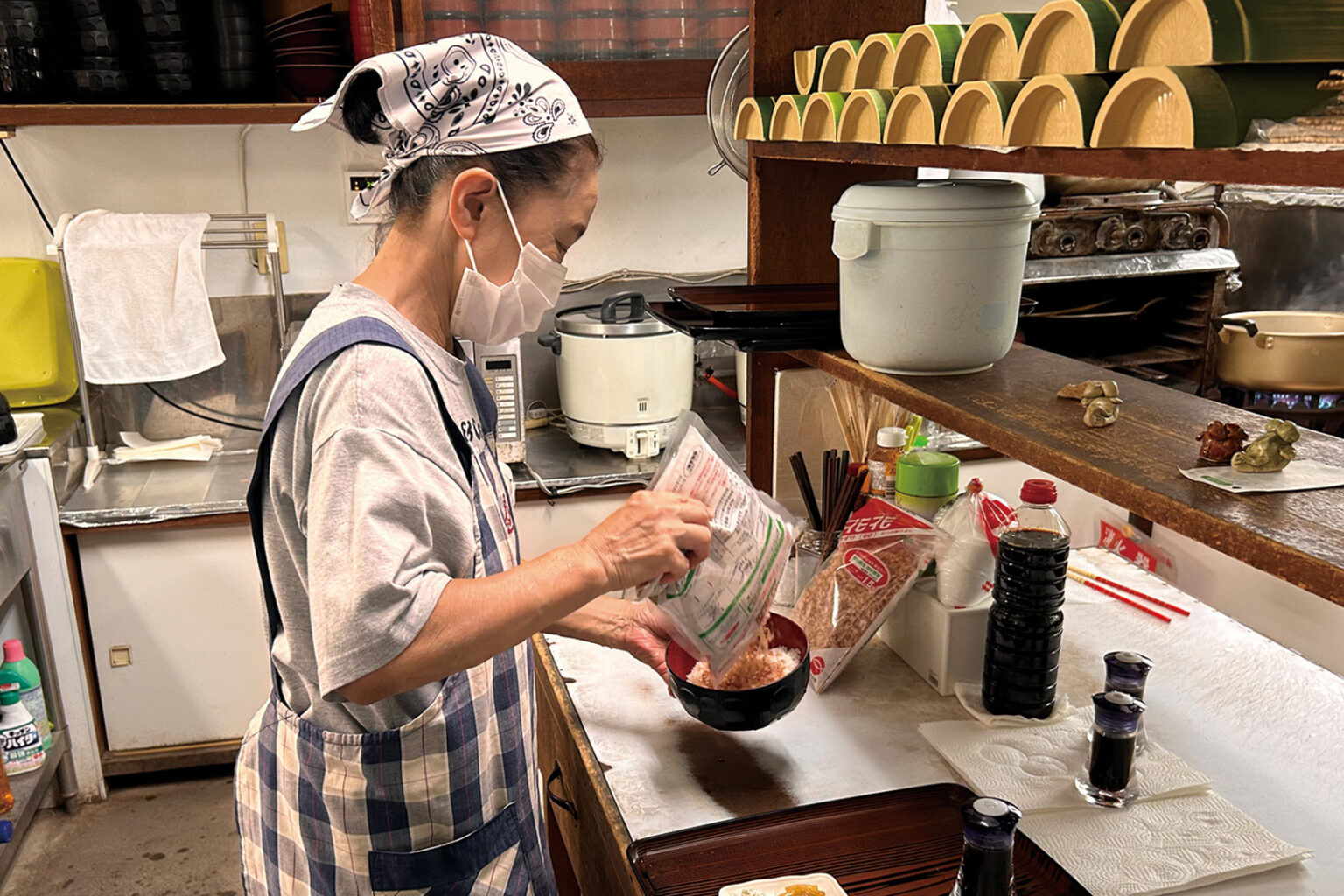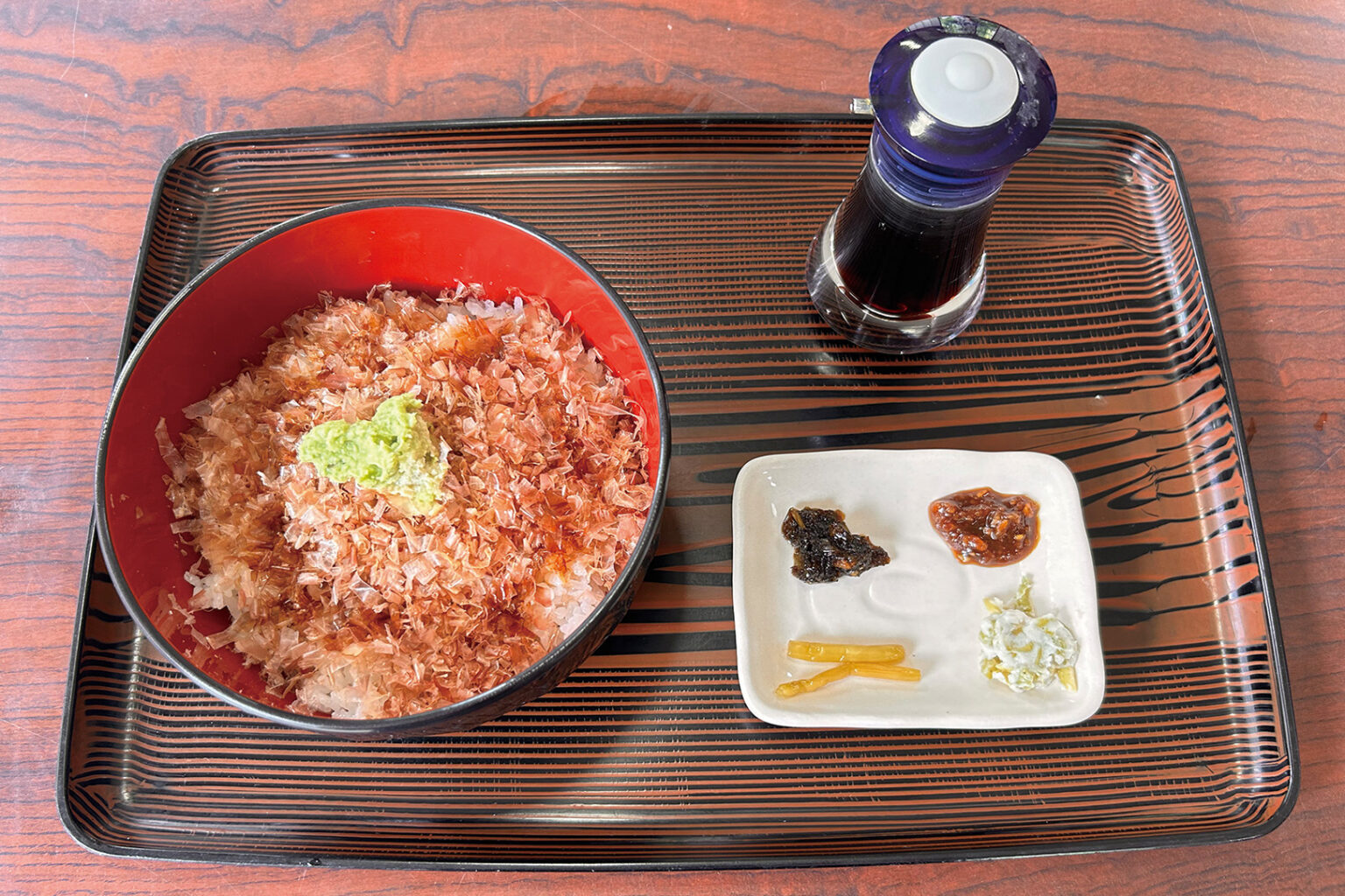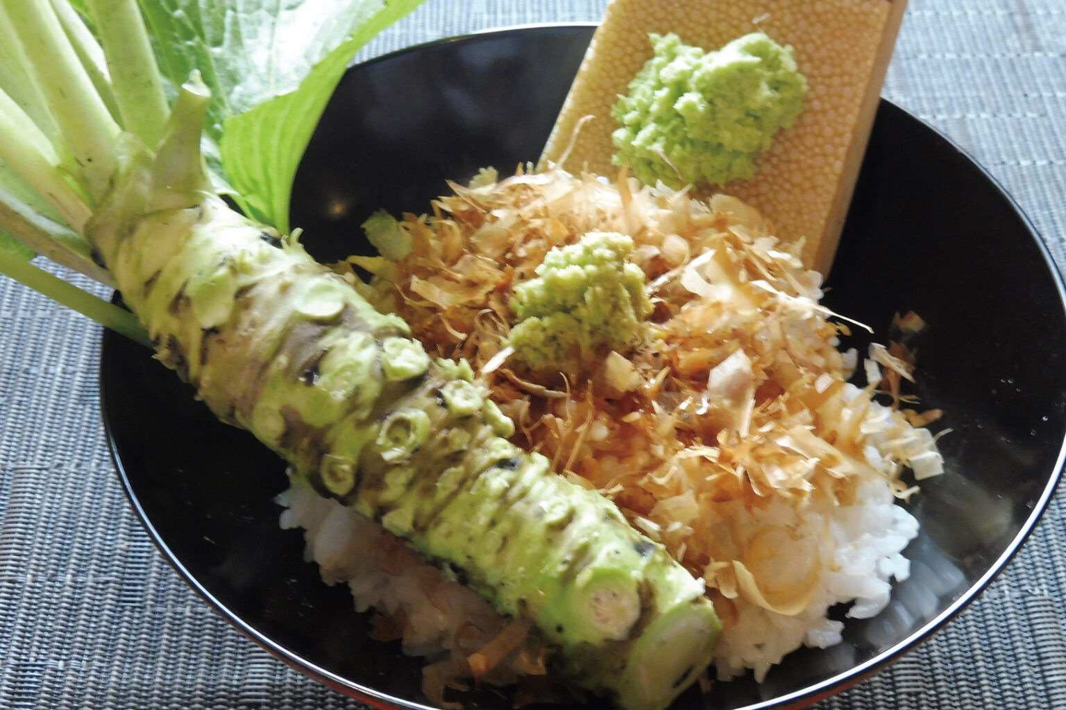 河津町は県内有数のわさび産地で、明治時代から伝わる「畳石式わさび田」による伝統的な農法は世界農業遺産にも認定されています。ご飯の上におろしたわさびと鰹節をのせ醤油をかけて食べる「わさび丼」は、地元では昔から食べられていたものですが、今やこれを目当てに訪れる人が続出。「わさび丼の聖地」とまで言われています。