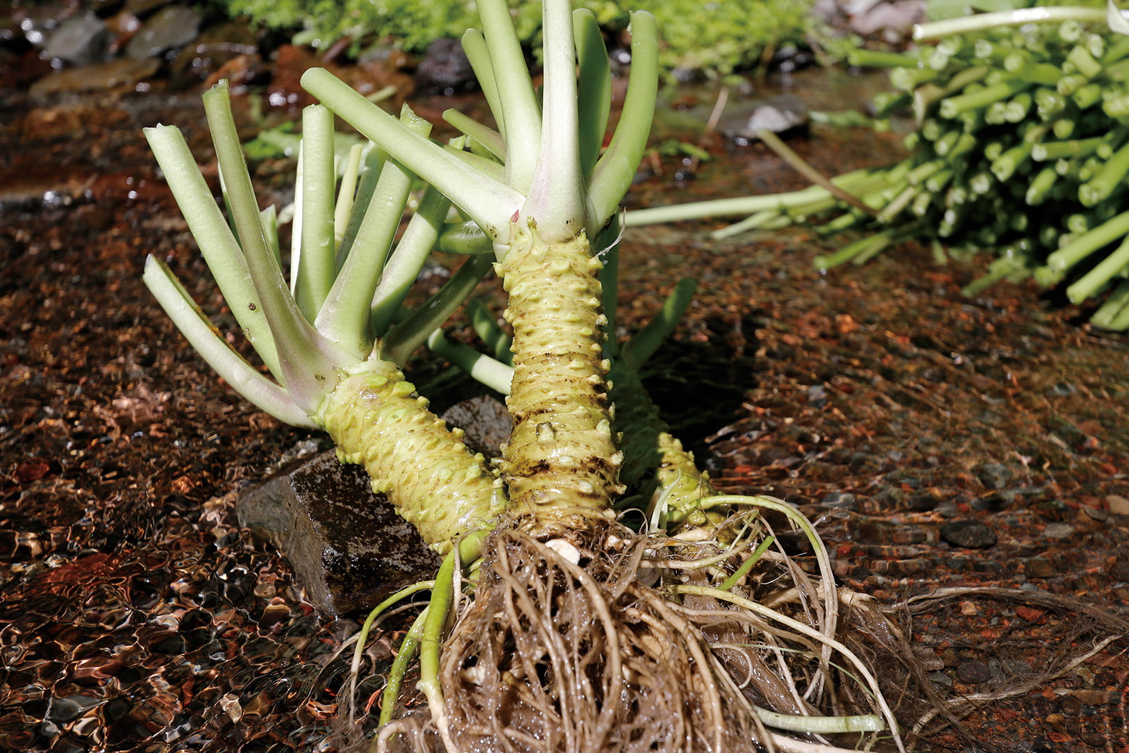 「桃沢わさび」は、愛鷹山にある桃沢川の源流付近で育ちます。かつて噴火を繰り返した愛鷹山では、火山噴出物が雨水を蓄え、豊富な湧き水となってわさび田を潤します。森の木々は直射日光を遮る天然のカーテンとなり、わさびの生育に最適な環境を作り出しています。桃沢わさびは、清らかな水の恵みが凝縮された逸品です。
