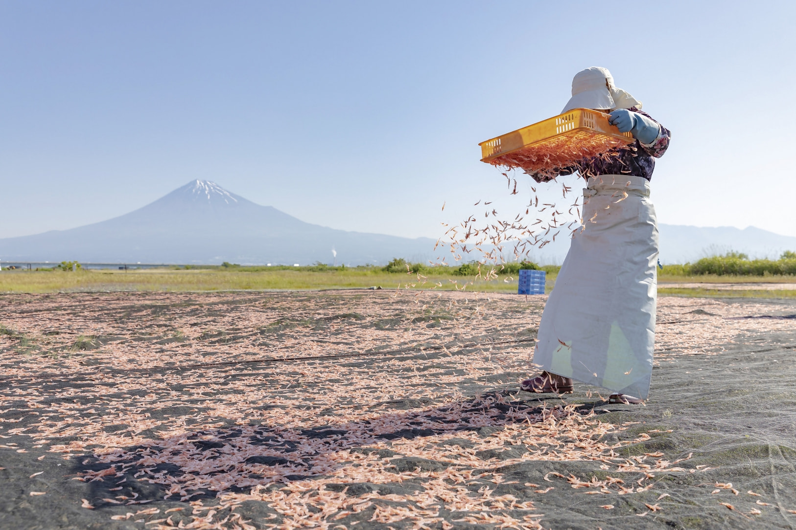静岡市の特産・桜えび。富士山や南アルプスなどから清流が流れ込む駿河湾の独特な構造がその生育に適しており、由比漁港での水揚げ量は日本一を誇ります。新鮮な桜えびは甘く口の中でとろけると評判で、釜揚げやかき揚げにしても絶品。春と秋のわずかな漁期にしか見ることができない天日干しの様子は季節の風物詩です。