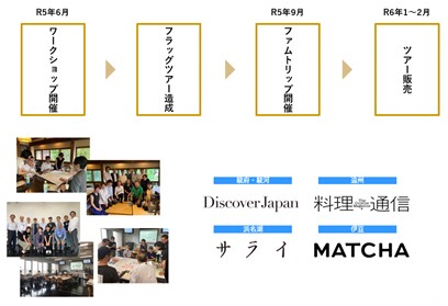 2022年度はモデルツアーを作成し、2023年度はそのツアーをベースに各地区で地域の方々とワークショップを開催。ワークショップで出た案をもとにフラッグツアーを造成し、下記メディア向けファムトリップを行いました。年度内には体験コンテンツの販売までを行う予定です。