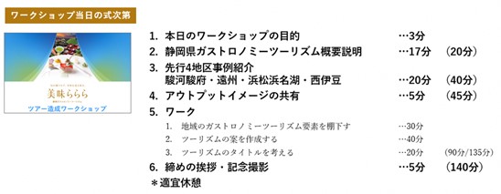 1回のワークショップは約2時間半。当日の目的、ガストロノミーツーリズムの概要説明、先行4地区の事例紹介、当日のゴールイメージの共有、そして90分程度のワークを行ないます。