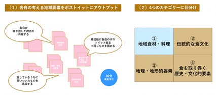 ワークではまず5,6人のチームに別れて、地域のガストロノミーツーリズム要素を棚卸し、チーム内で共有を行います。ガストロノミーツーリズム要素は①地域食材・料理 ②伝統的な食文化 ③地理・地形的要素 ④食を取り巻く歴史・文化的要素の4軸でポストイットに書き出します。その後、チームで発表しあいながら模造紙に整理していきます。*30分程度