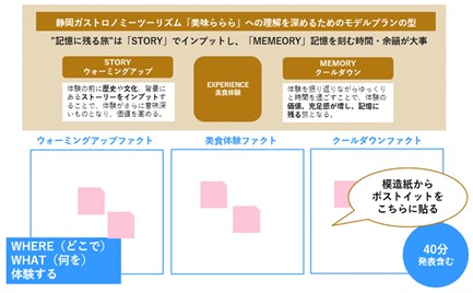 次に、ガストロノミーツーリズムへの理解を深めるためのプランの型であるウォームアップ→食体験→クールダウンの流れに棚卸したガストロノミーツーリズム要素を当てはめて全体の流れを作ります。*40分程度