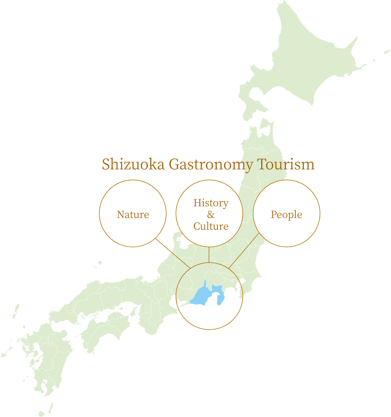 ガストロノミーツーリズムは、その土地の気候風土が生んだ食材・習慣・伝統・歴史などによって育まれた食を楽しみ、その土地の食文化に触れることを目的としたツーリズムです。静岡県は、日本一高い富士山や日本一深い駿河湾をはじめとする多様な風土に恵まれた、439品目の多彩で高品質な農林水産物が生産される「食材の王国」です。各地域の歴史・風土が育んだ食材や食文化を観光資源と融合させ、来訪者に感動体験を提供するガストロノミーツーリズムを推進しています。