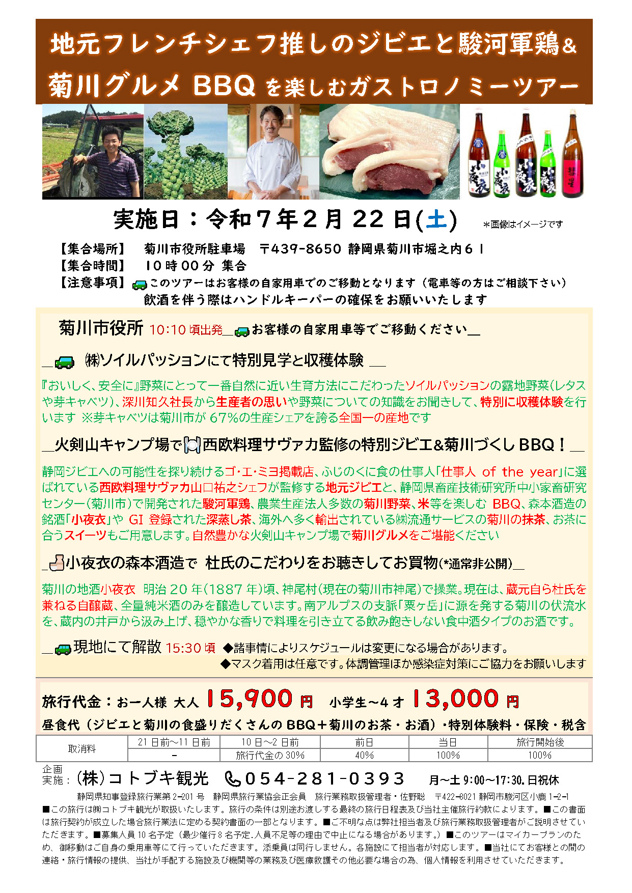 ■行程:菊川市役所10:10出発→㈱ソイルパッション特別見学と収穫体験→火剣山キャンプ場で西欧料理サヴァカ山口シェフ監修のジビエ&菊川づくしBBQ→小夜衣の森本酒造お買い物(通常非公開)→15:30頃 現地解散