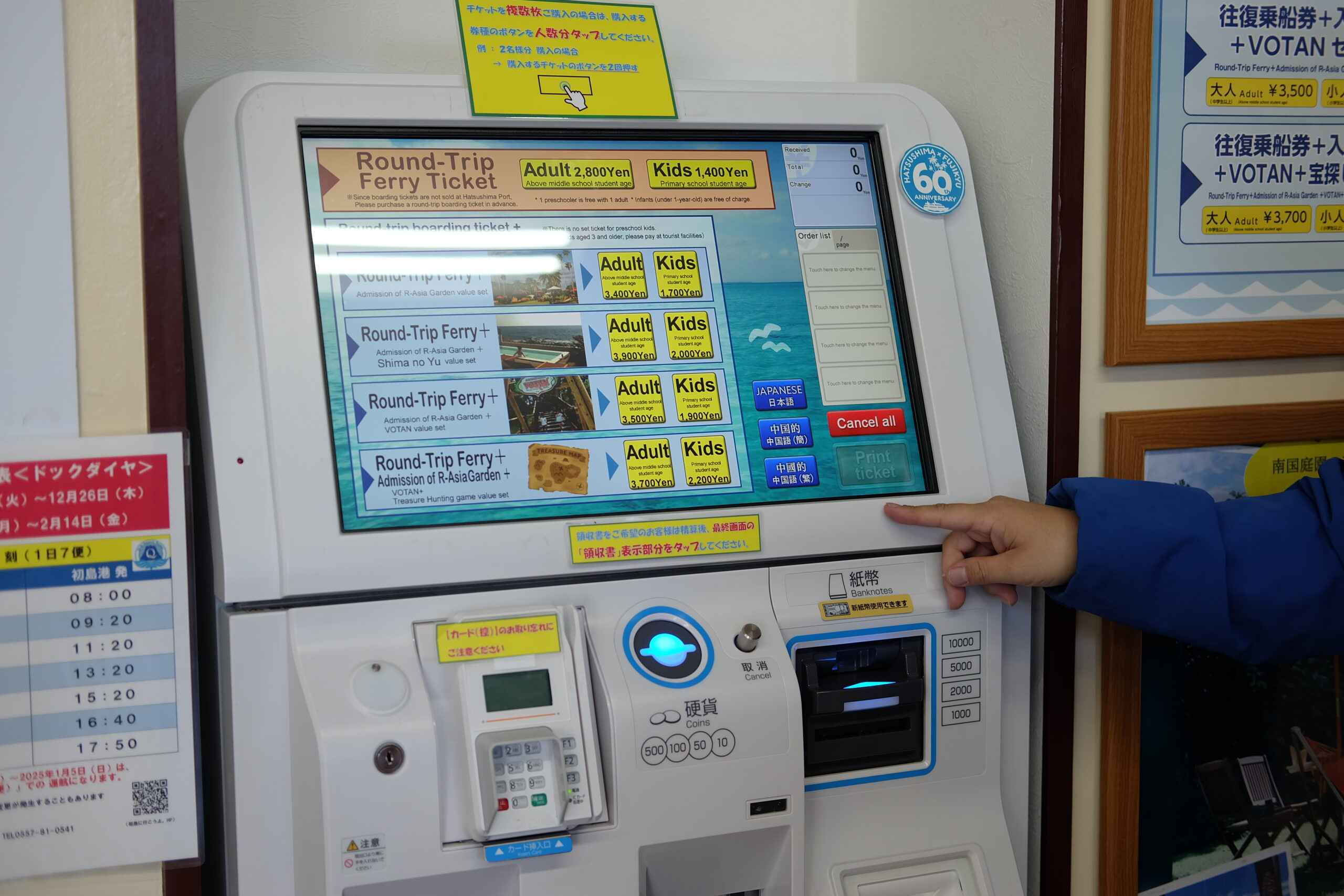 熱海乗船場に付くと、お土産売場には一際目立つ「初島レモンまみれコーナー」。初島と熱海の特産品が売られています。乗船チケットは窓口でも購入できますが、日本語以外にも対応している券売機が2023年4月に導入されたようで、今回は券売機でチケットを購入しました。アジアンガーデン、島の湯、VOTAN、宝探しの乗船券とのセット券も購入することができます。