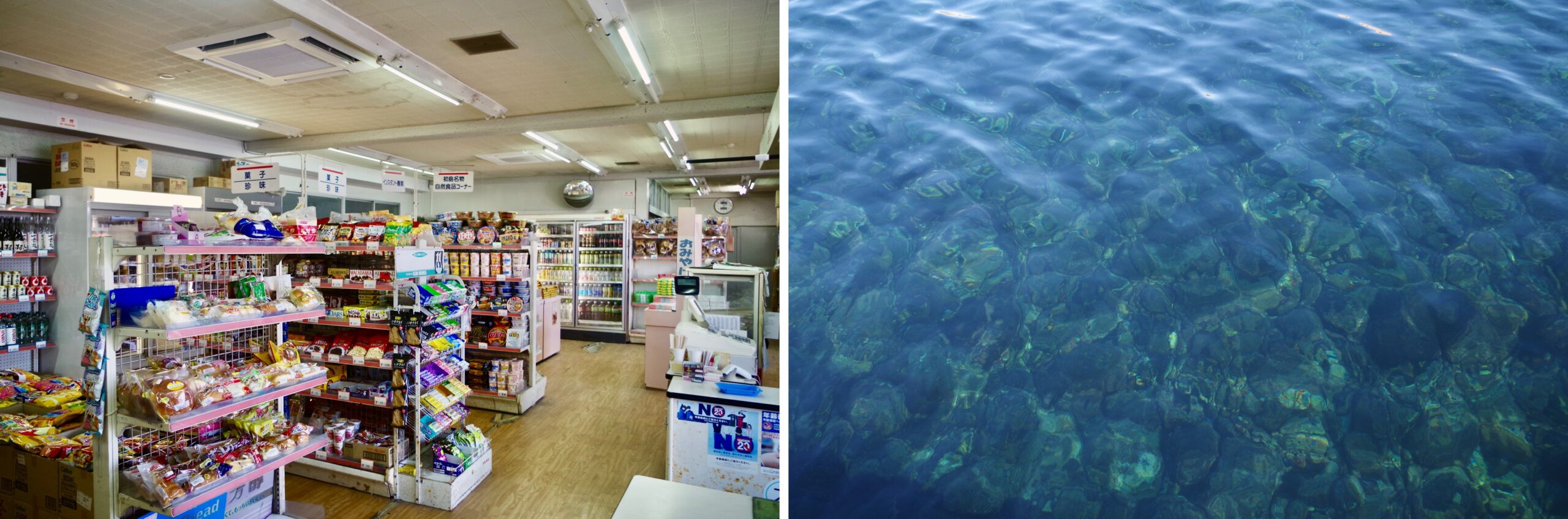 左下)日用品や食材等が揃う初島漁港スーパーマーケット 右下)底まで見える透き通った海面