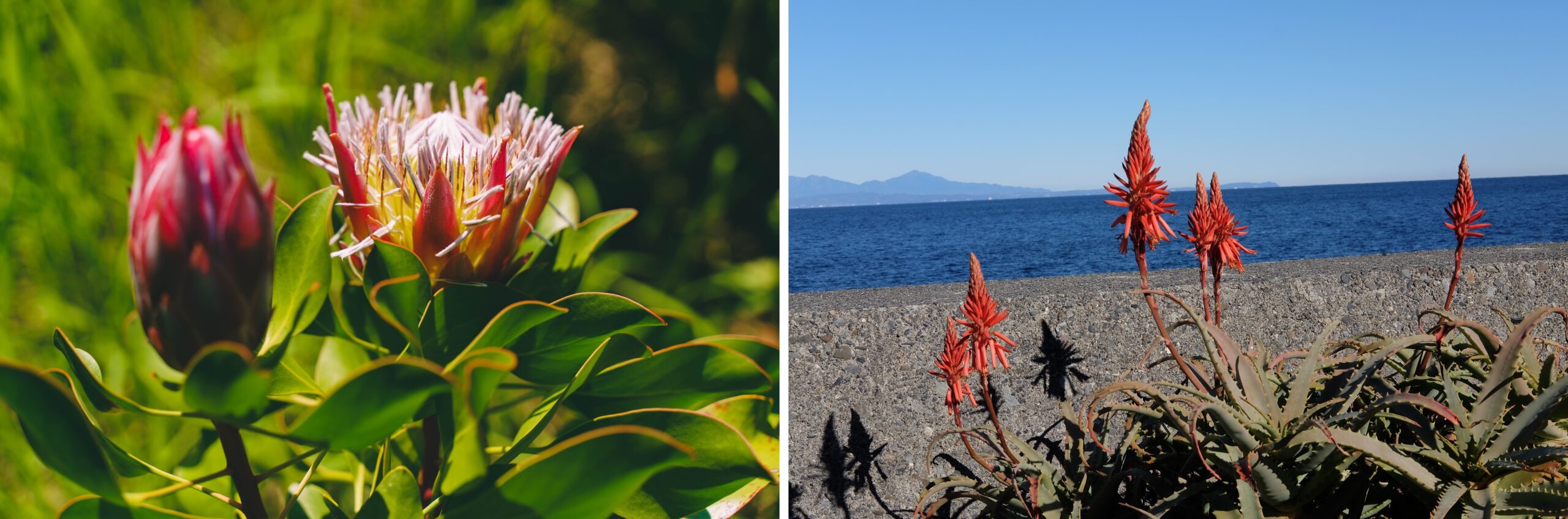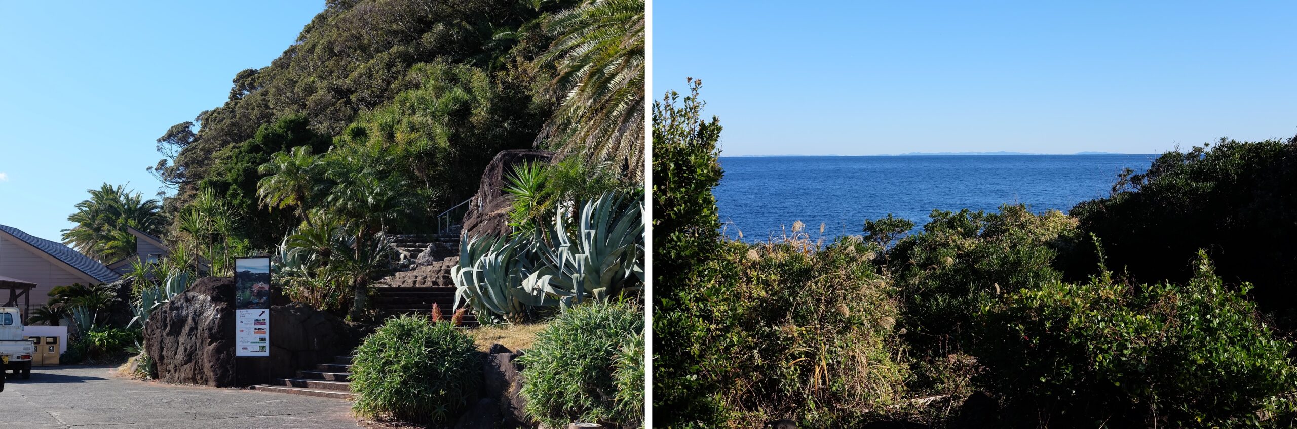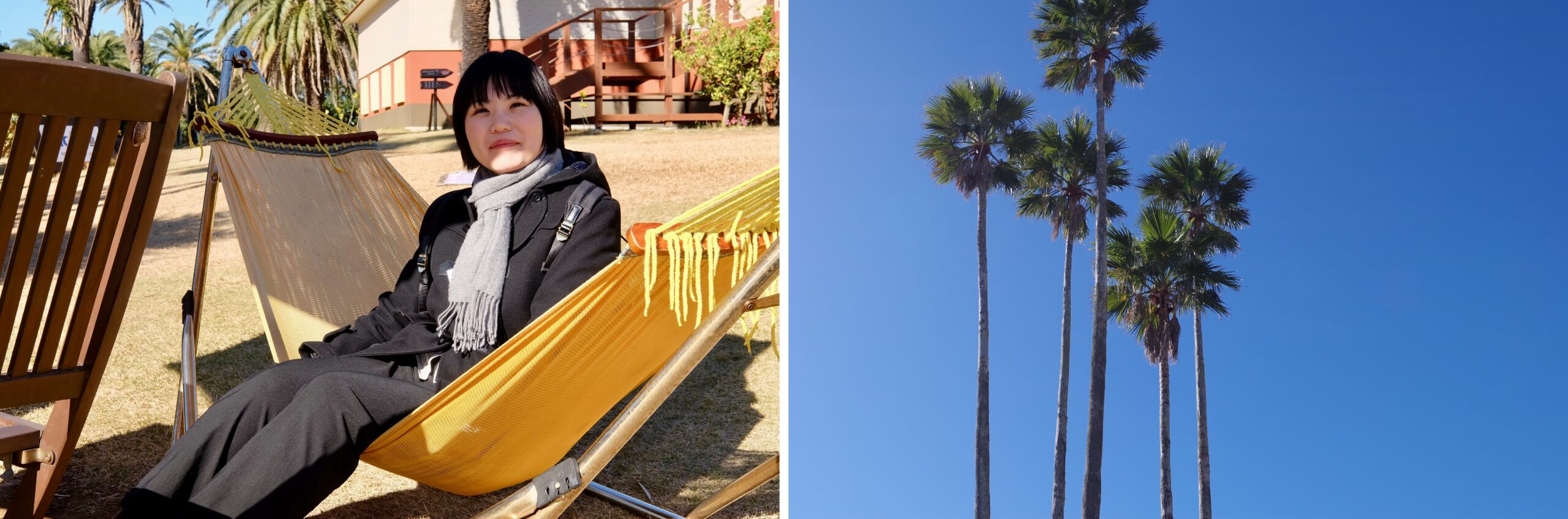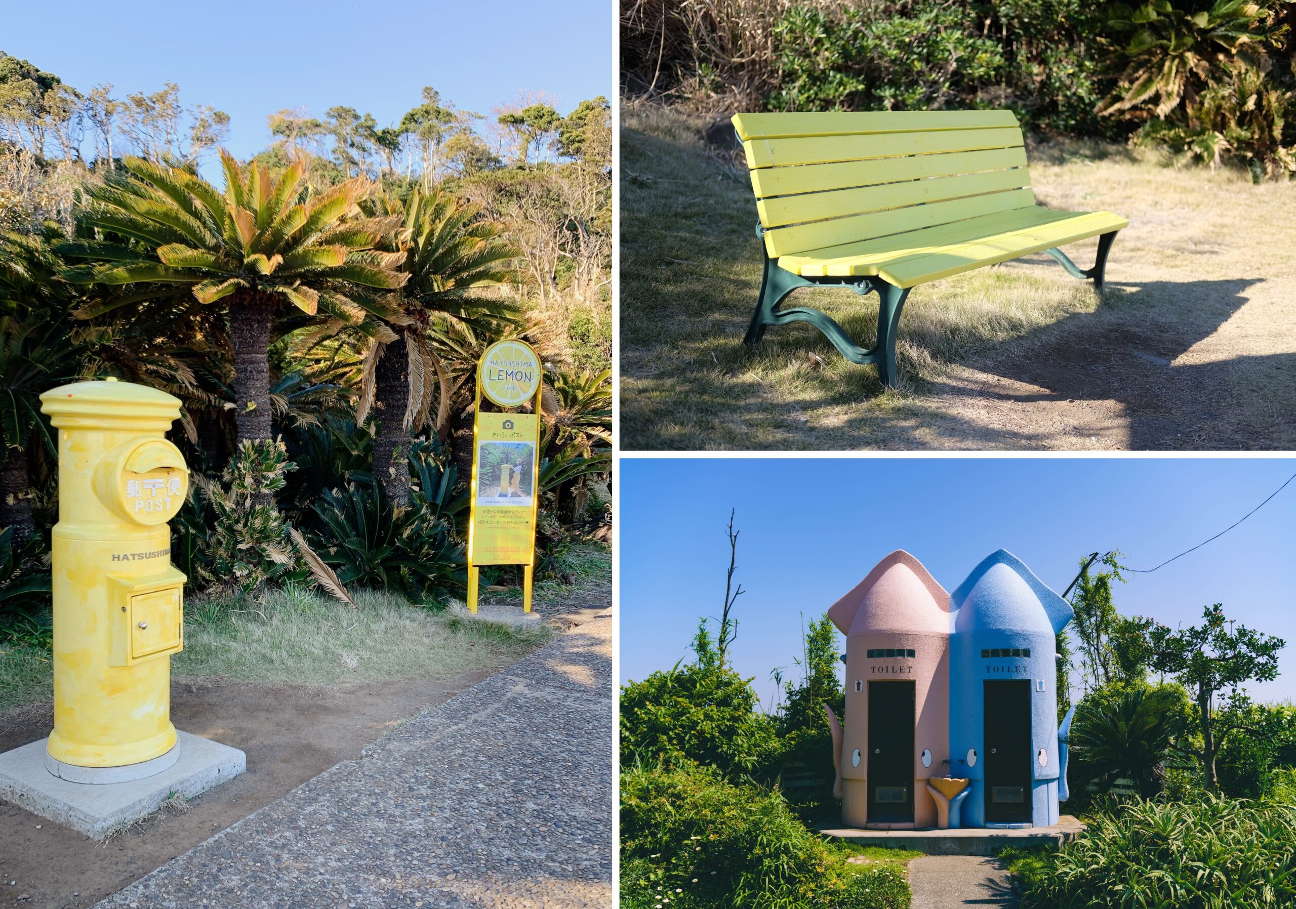 リゾートを満喫できる場所PICA初島まで、山田さんを先頭に散策途中、青とピンクのイカトイレと黄色いレモンポストを発見。ヤシの木や熱帯の植物、花、極楽鳥花(ストレリチア)アロエ群などを見ながら5分ほど歩くと、「PICA初島」の売店が見えてきます。その隣には、海を眺めながら楽しめる「海泉浴 島の湯」と「海のプール」があります。訪れたのが12月だったため閑散としていましたが、夏には多くの人が集まる賑やかな場所に違いない、と感じました。