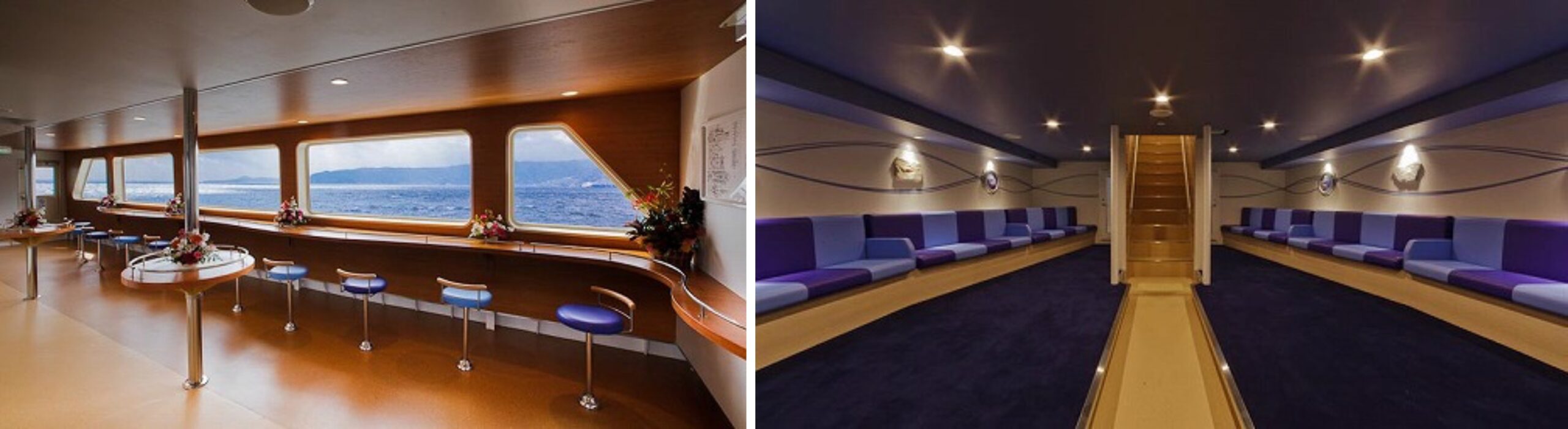 船は3階建て仕様の大きなクルーズ船で、本土と初島を結ぶ連絡船としても活用されています。船内は木目調の落ち着いたデザインで、ボックスシートやカウンター形式の席が配置されており、さらに下の階には靴を脱いでリラックスできるスペースもありました。この快適な空間で、船旅の始まりから満足感を味わうことができます。