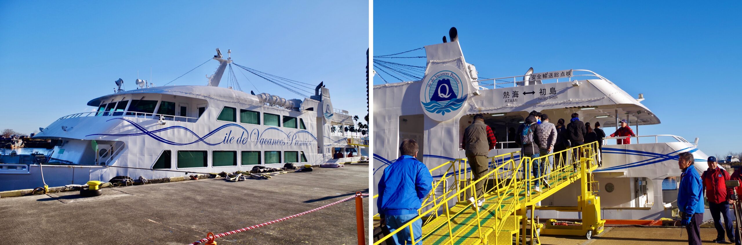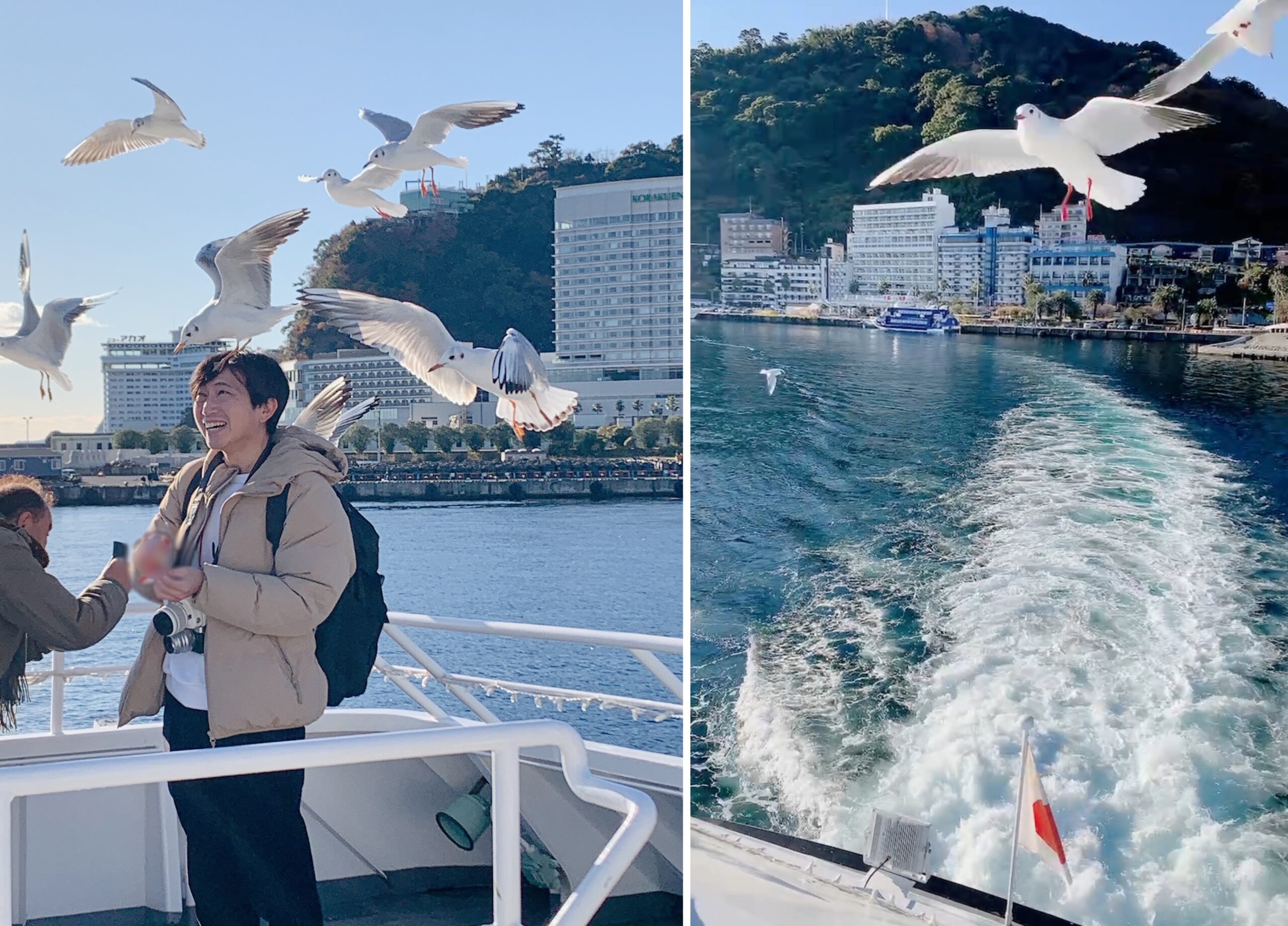 いよいよ熱海港発のクルーズ船イルドバカンスプレミア号に乗船。風もなく波も穏やかな絶好の観光日和で、船が走り出すと待っていたかのように、たくさんのカモメが集まってきます。デッキで山田さんから「これをあげてみて」と、餌を渡されました。それをカモメに向かって差し出した瞬間、一斉に突っつき合いながら、餌を奪い合う様子に驚きました。