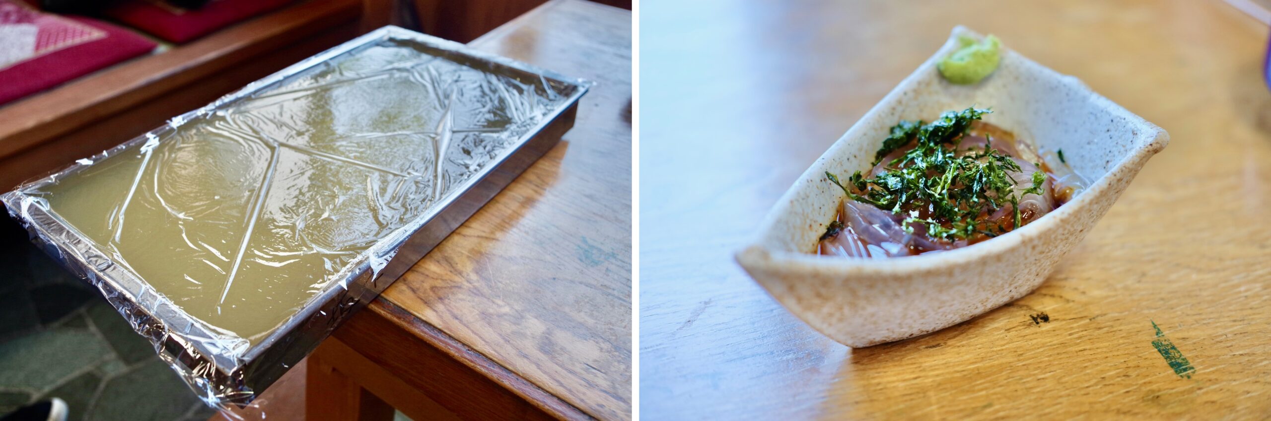 余談ですが、「ところてん」と「寒天」の違いが気になり調べてみました。天草を煮出して作るのが「ところてん」で、その「ところてん」を冷凍・乾燥させたものが「寒天」だそうです。寒天が寒冷地で作られる理由も、この製法の過程に由来していると知り、納得しました。