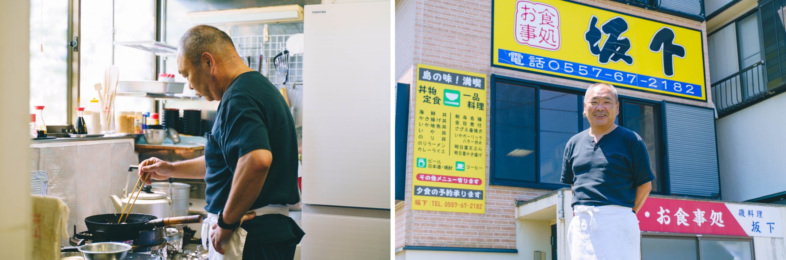 坂下さんは気さくな雰囲気ながら、初島漁業協同組合と初島区事業協同組合の理事を務める、島の重要なリーダー的存在です。手際よく調理してくれた丼やお料理は、味はもちろん丁寧な作業とおもてなしが伝わってきます。
