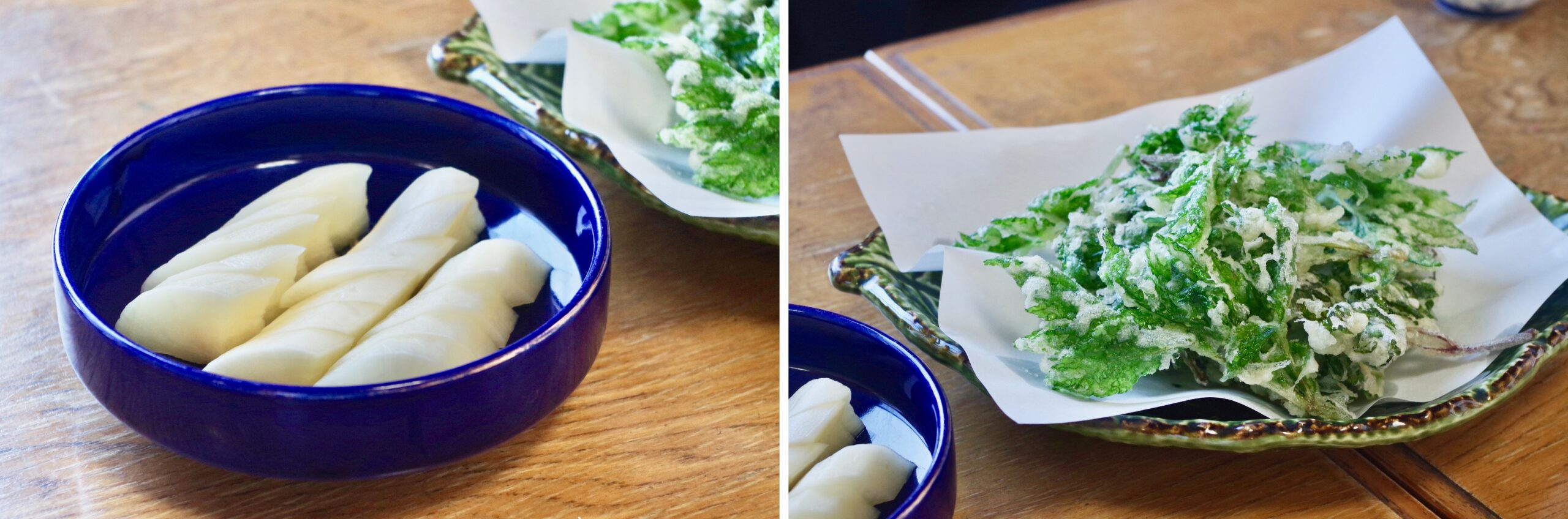 灯台から島の中央を通り、食堂街へ向かい、山田さんおすすめの「磯料理・御食事処 坂下」さんを訪れました。「初島の特産品を味わいたい」とリクエストしていたところ、少し時期は早いながらも「大根のビール漬け」を特別に用意していただきました。