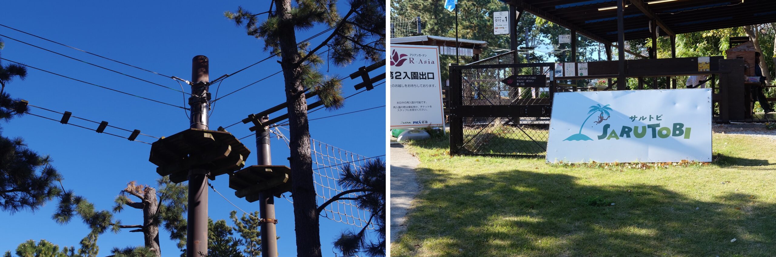 「また少し歩きます」と藤原さんの後を追い、「初島アドベンチャーSARUTOBI」がある、アスレチック広場へ。本格的にハーネスをつけ体験できるスポットで、初級から上級まで、いくつかのコースがあります。まず、全体を見て「できそう」と思うコースを選んでいただきたいそうです。子どもたちが安心して楽しめるアスレチックもあり、「トレジャーアイランドに眠る幻の宝を探せ!」と称する、宝探しアドベンチャーなど、家族で楽しめる体験エリアもたくさんあります。