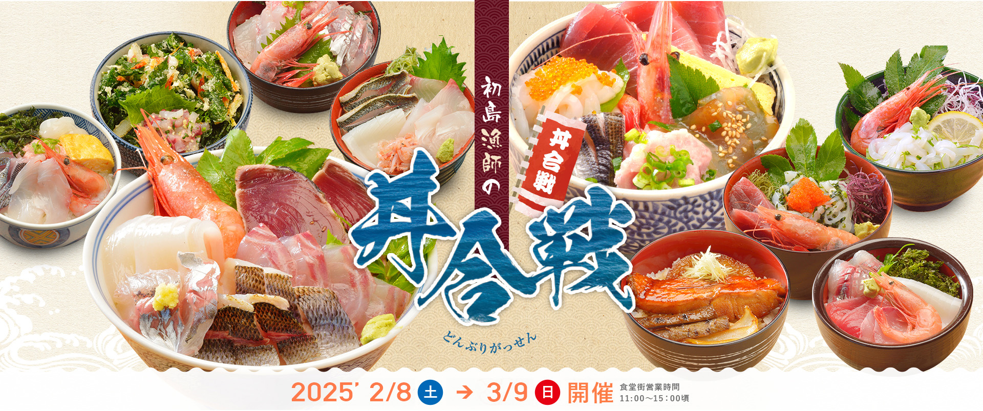 「丼合戦」は、初島の人気コンテンツでもあり、2025年は2/8(土)〜3/9(日)まで開催されます。