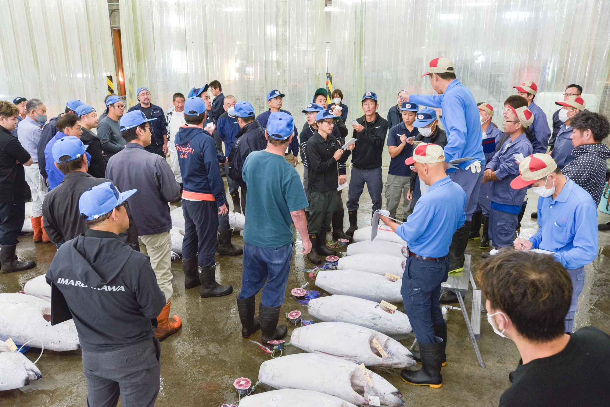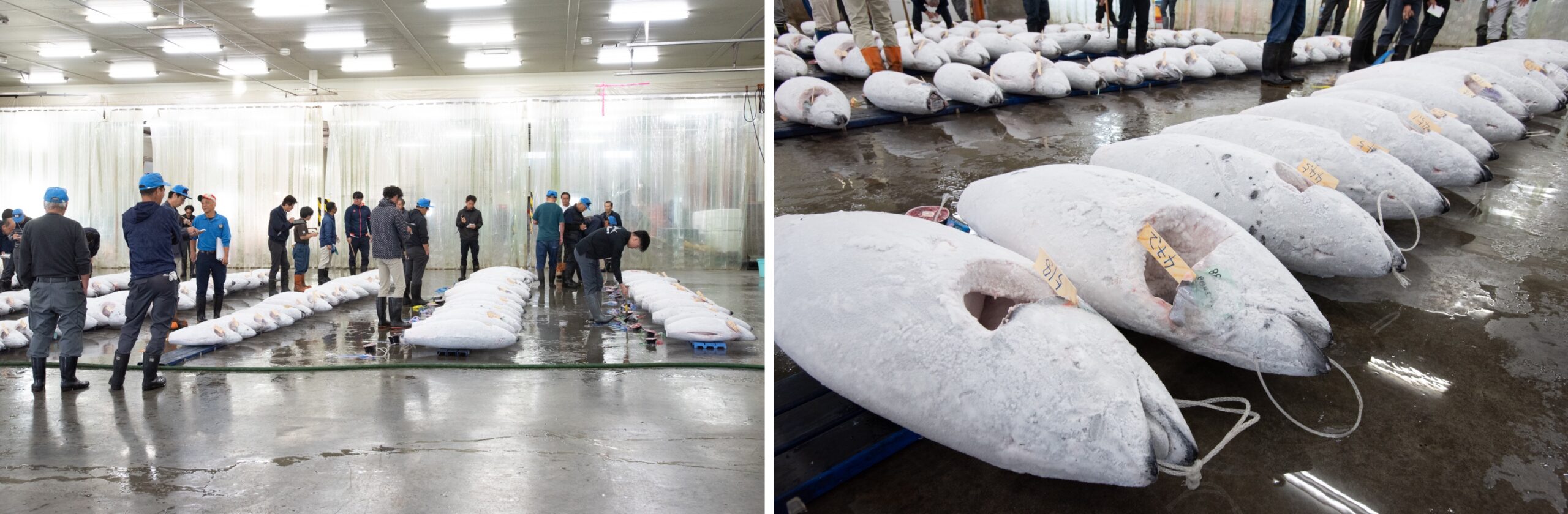 この日のマグロは4社から出されたもの。船籍はほとんど日本。漁場は南インド洋、ケープタウン西の大西洋などどれも南半球で獲れたものであった。マグロのセリ場は学校の体育館を一回り小さくしたほどの面積があり、天井が高かった。マグロの鮮度を維持するため冷房が利いているらしくひんやりする。