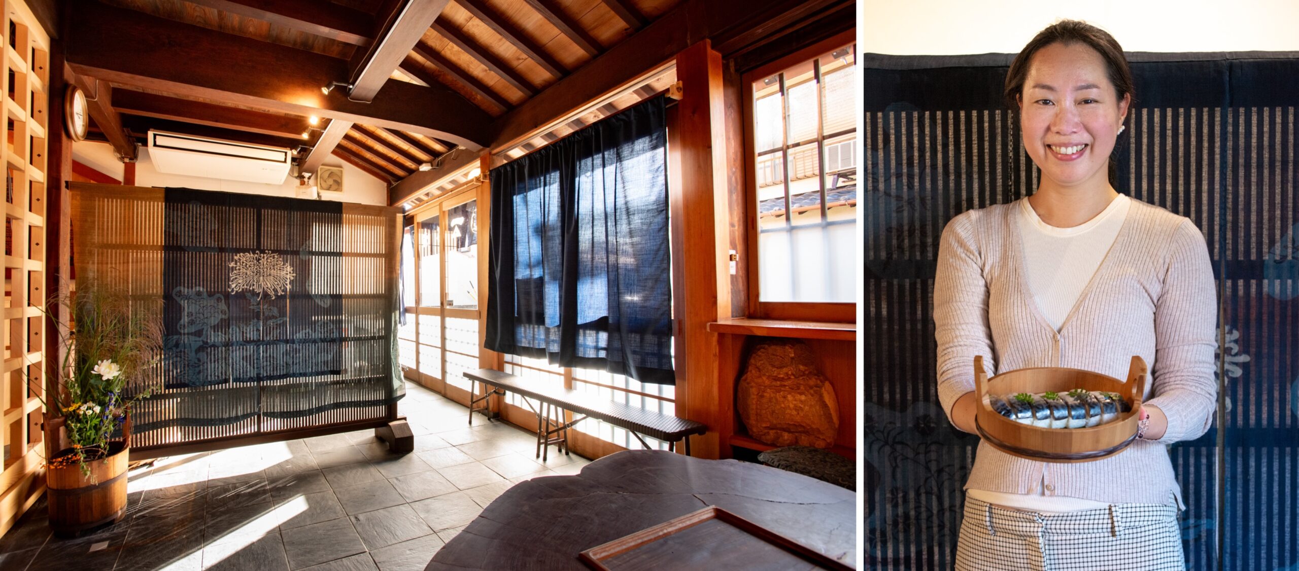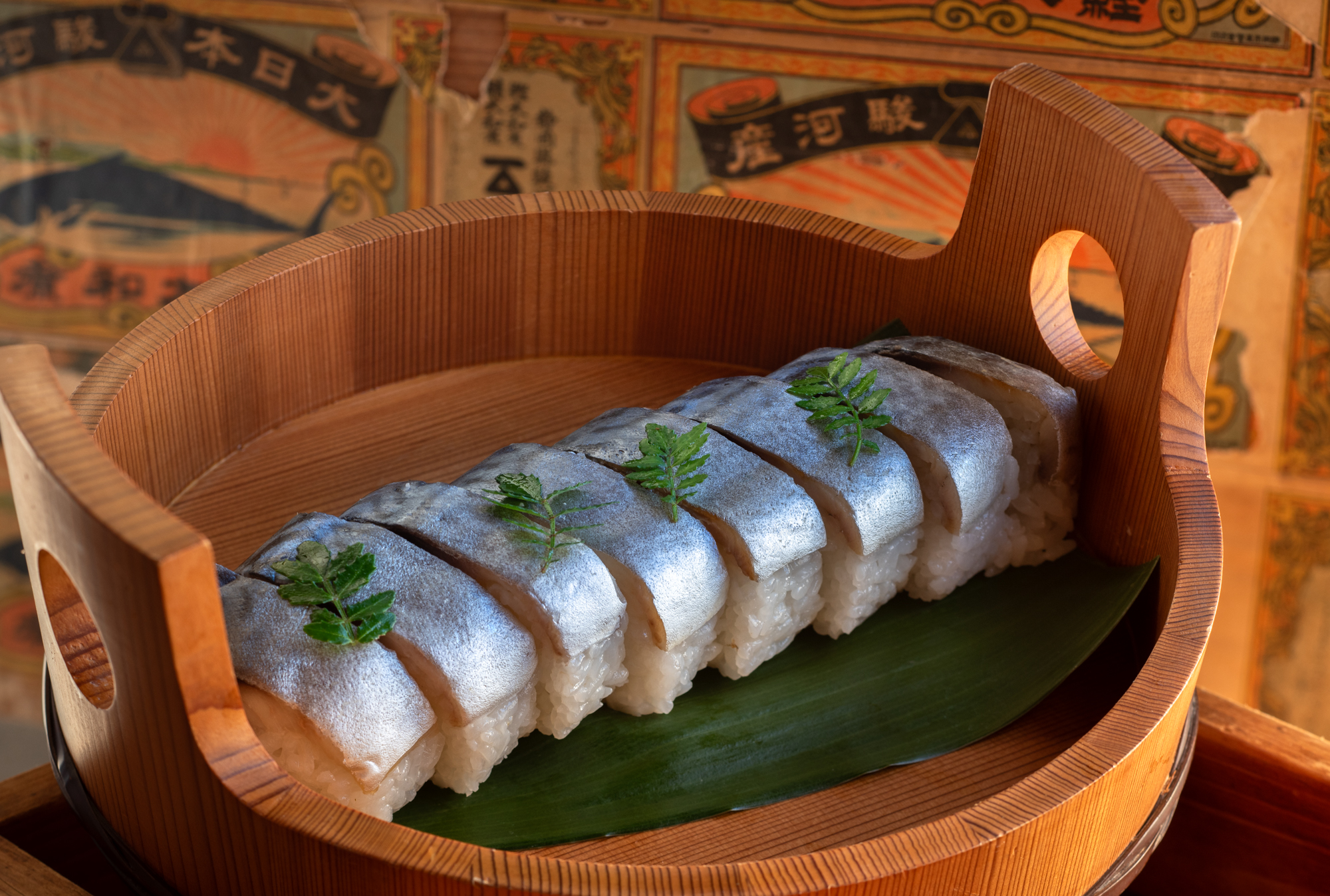 ここは、古くから塩鯖を作ってきた店で、その流れで鯖寿司を作ってきた。塩サバを酢で締め、酢飯を載せて棒鮓にしたもので、製法は関西のそれとほぼ同じである。酢飯は、関西のそれより酢のきれがよいと感じる。