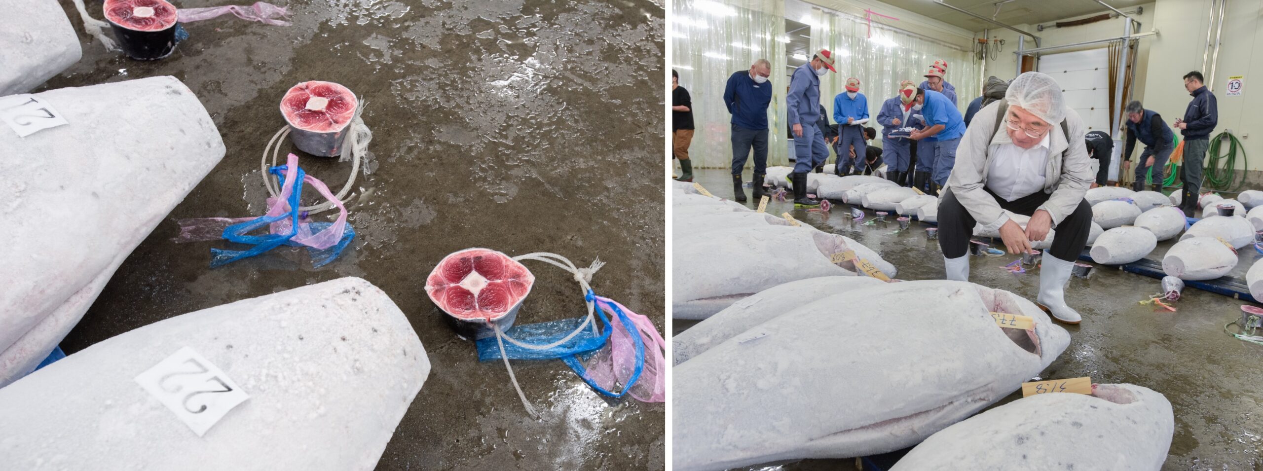 セリ場にはすでに102本のミナミマグロが並んでいた。魚体は25㎏~90㎏とまちまちだった。ワタとエラは抜かれ、尻尾は切り落とされ、冷凍されて真っ白な紡錘体のような姿には生物という感じはなかった。尻尾近くの胴体の一部が輪切りにされて置かれている。テレビなどでおなじみの姿だ。この部分は冷凍が溶けミナミマグロ独特の赤い筋肉がめだっている。輪切りには、産地、会社を区別するためのカラーリボンがつけられている。仲買人たちが鉤のついた手鉤をもって輪切りの尾部をひっかけて肉質などを観察し始めた。色合いなどで、脂肪分や肉質などがわかるようだ。
