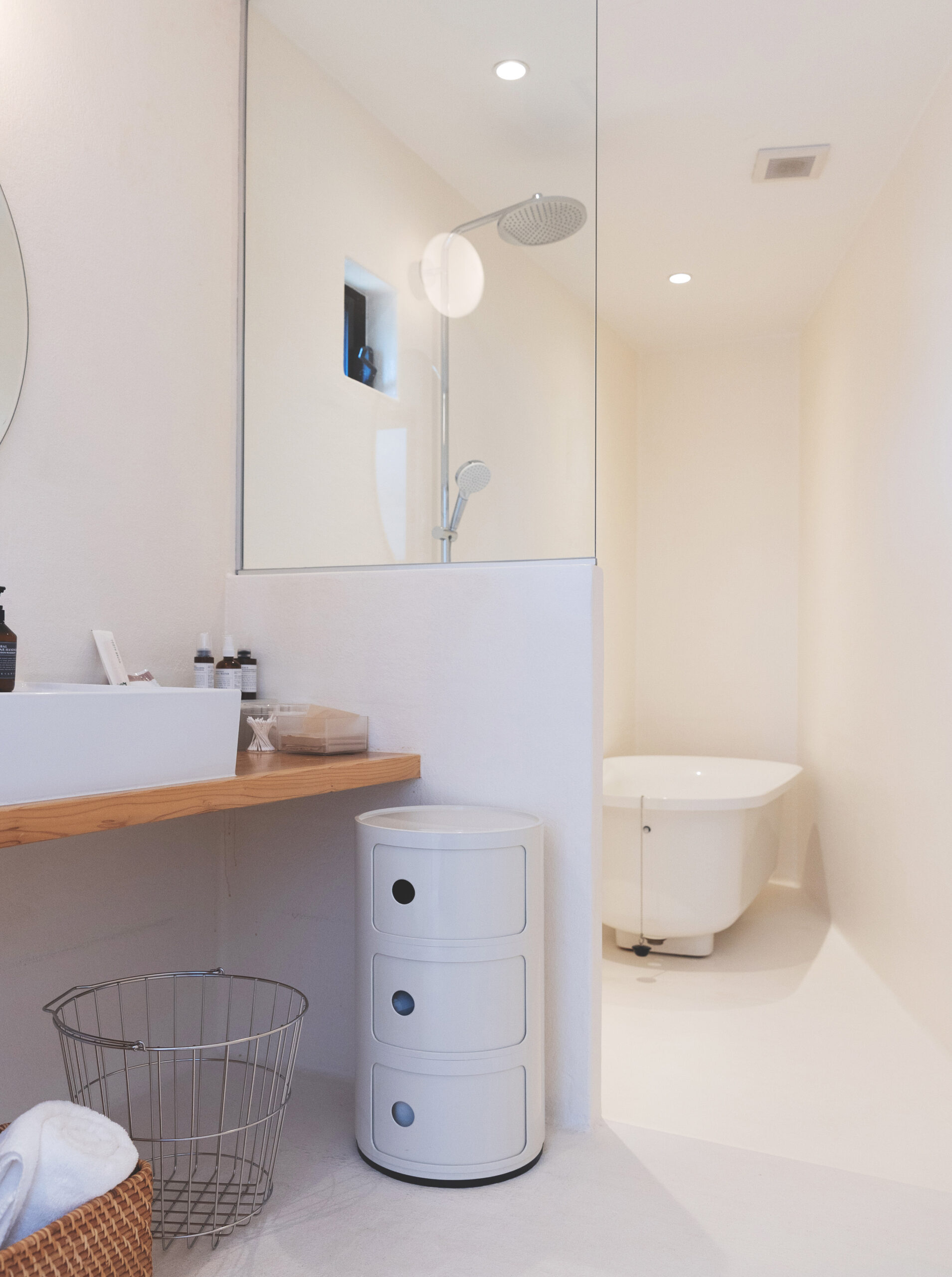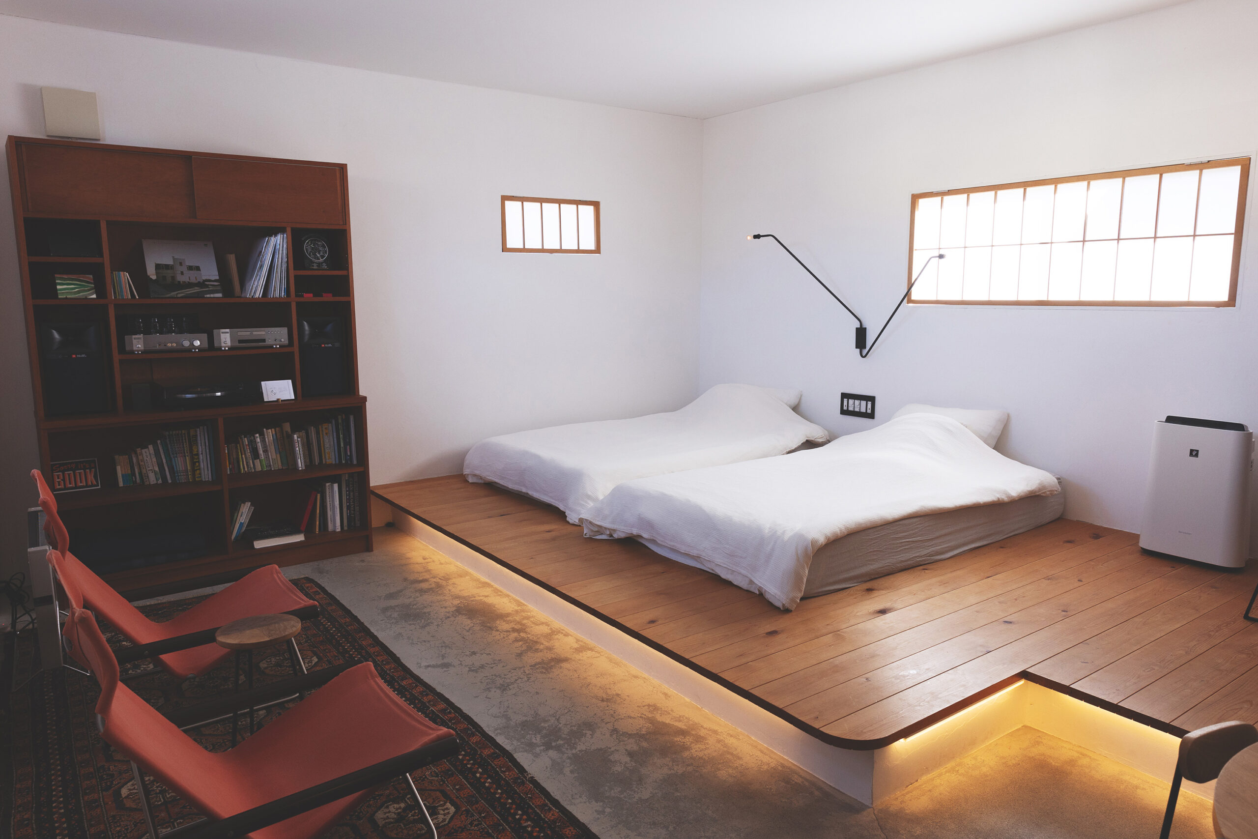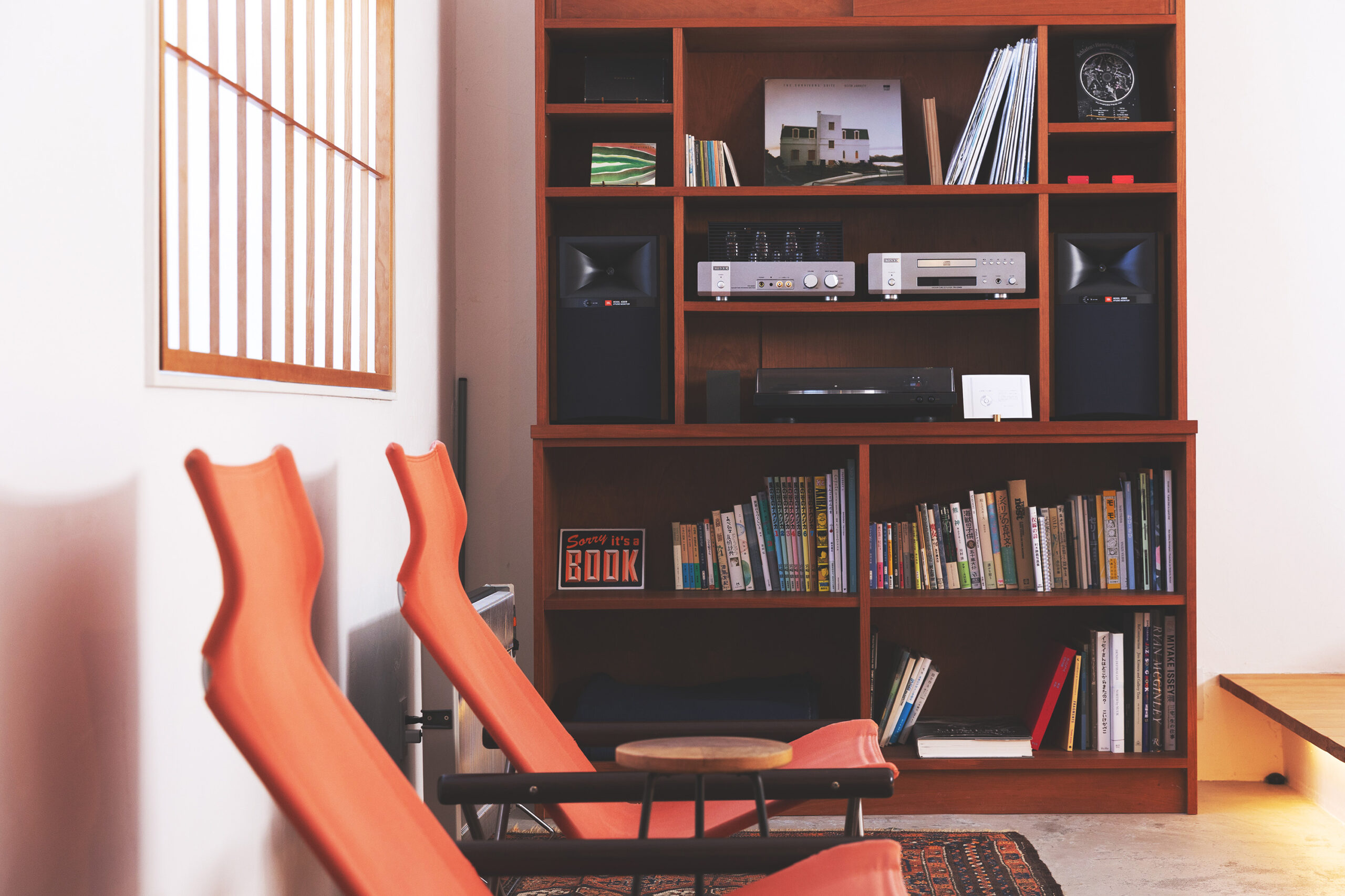ちょっと驚いたのは、ホテルのドアを開けると、そこはいきなり客室! という状況で、2台のベッドが目に飛び込んできた。フロントもなければエントランスロビーもない。完全予約制で、無人チェックインOK。自分でロックを解除し、タブレットに必要事項を入力するだけでチェックイン完了となる。ホテルの概念を超えた新しいスタイルにワクワクしながら室内をさらに観察すると、冷蔵庫、電子レンジ、オーブントースター、小さなシンク付きの調理台、センスのいい器やカトラリー…。旅の途中で買った地元の味を食べることができるようになっているのだ。ミニキッチンの反対側に目をやると、オーディオ機器があり棚にはジャスのレコードや本が並ぶ。スマホを置いて過ごす夜もたまにはいい。