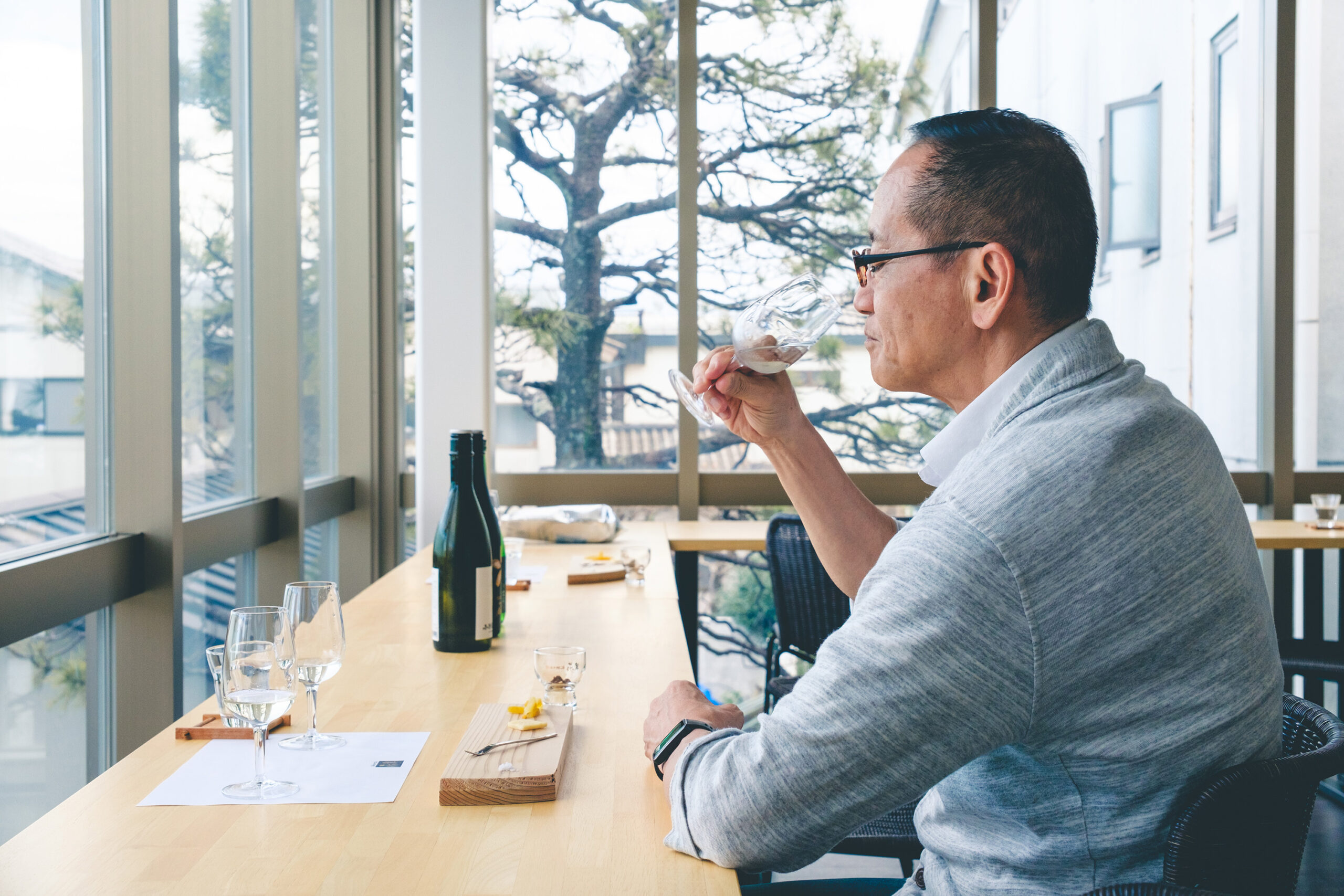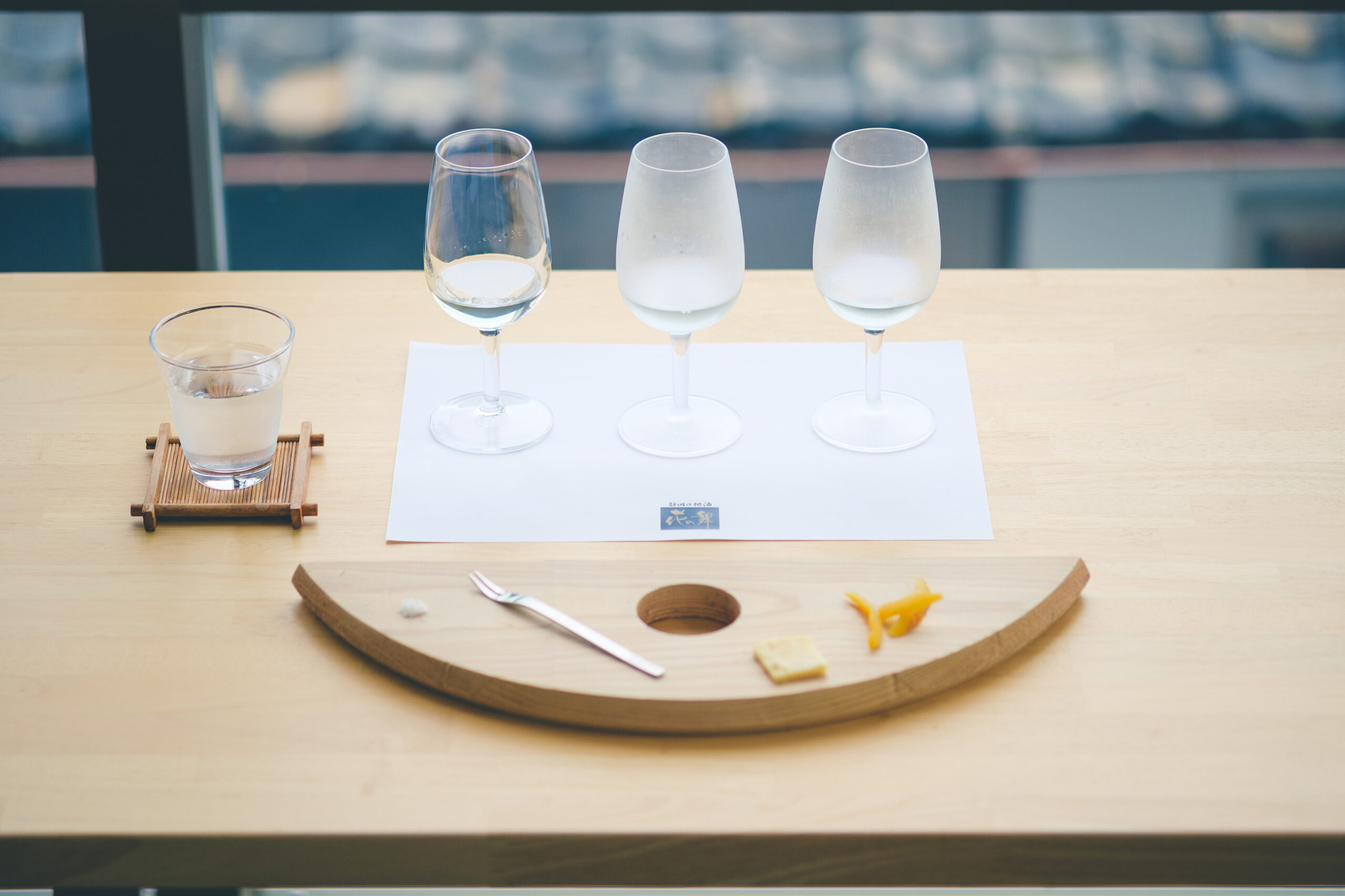 酒しぼり体験の後は専用ラウンジに場所を移しテイスティングタイム。この日は杜氏の鎌江慎太郎さんが全ての工程を一人で仕込んだという希少酒「小仕込みの原酒」と、火入れをしていない「限定純米吟醸生原酒」、ワイン酵母で仕込んだ「Abysse(アビス)」が用意され、「甘夏のピール」「大吟醸の酒粕」「遠州灘の海水塩」とのペアリングが楽しめた。