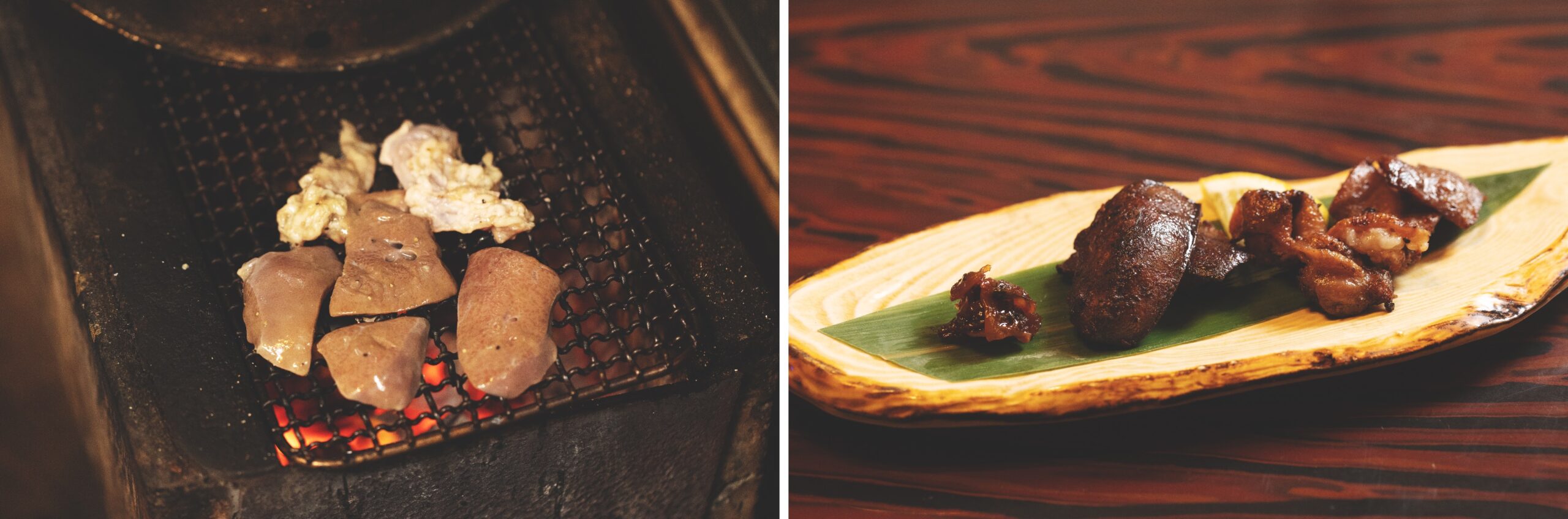 猪本来の味を楽しむなら、水で茹でて岩塩を振っただけの「リブ」がいいとすすめられ、早速ガブリ。骨周りの肉だけあって旨味があり、まさに自然のままの素朴な味わい。もちろん臭みはどこにもない。ここでしか味わえない逸品だ。コースの一品「もつ焼き」は、内臓を取り出した当日に岩塩と胡椒、ニンニク、ゴマ油で味付けするそうで、これを炭火焼きにして提供。その日によって内容は変わるが、レバー、大腸、小腸、心臓、胃袋、タン、小袋があるそうだ。レバー焼きについては片桐さんのおすすめの食べ方があるとのことで、言われるままに、レバーを口に入れペースト状になるまで噛んで、飲み込む。何だろう、この心地いい口に残る旨味の余韻は…。「ね、また口の中に入れてって言っているでしょ」と片桐さんが笑った。