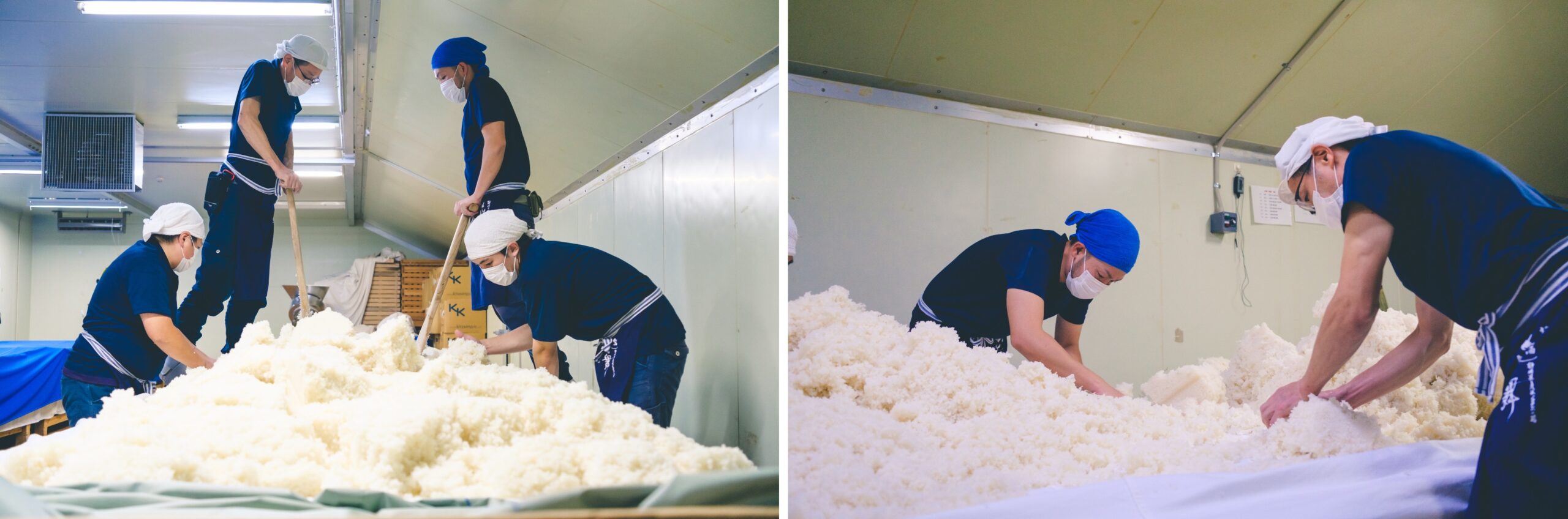 この日は特別に「製麹」の作業を見学させてもらえた。鎌江さんいわく、「一麹、二生酛(きもと)、三造り」と言われるほど麹づくりが一番大事で、蒸した米に麹菌を散布し、菌が均一になるようにもみほぐし、48時間かけて麹をつくるのだそうだ。花の舞酒造では8月~6月まで、三季に渡り酒を造り、3トン単位で行う大仕込みと120キロ単位で行う小仕込みで醸造。24銘柄の酒を製造しているそうだ。花の舞酒造では蔵見学も行っていて試飲も楽しめる。