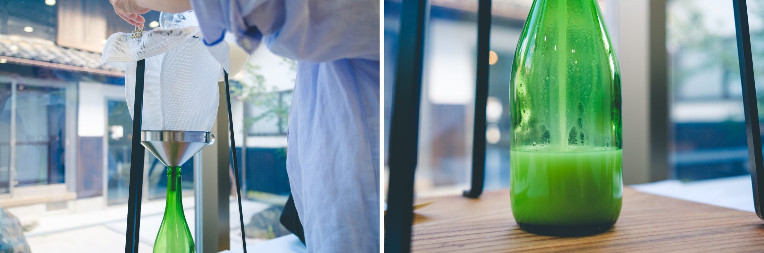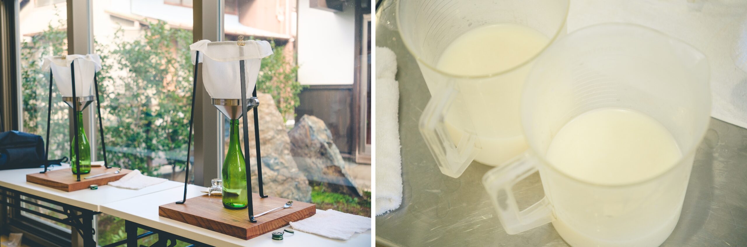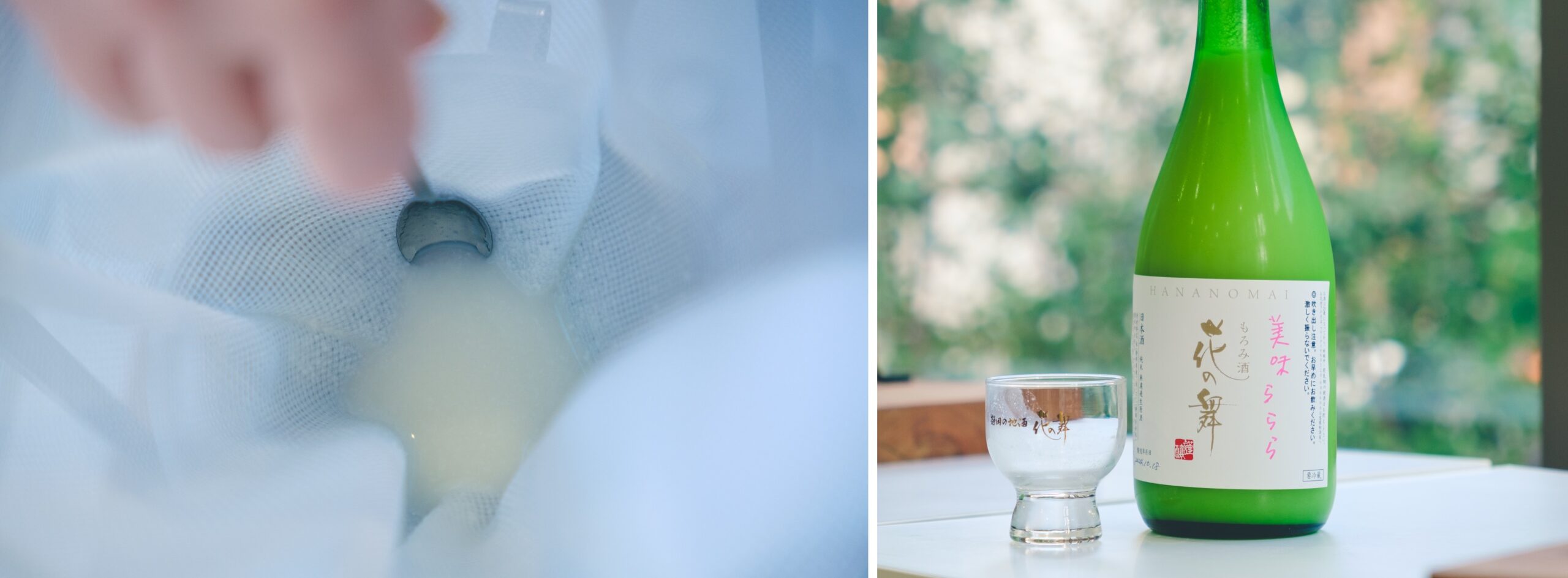 この日の案内役はソムリエエクセレンスの海野利重さん。体験ルームに入るや、テーブルの上に空の酒瓶がスタンバイ。海野さんの指示の元、その上に漏斗をセッティングし、さらにお酒をしぼるための袋状のフィルターを設置。ここで手渡されたのが、日本酒の元となる「もろみ」だ。蒸米や麹、酒母、仕込み水で造られた発酵中の液体で、乳白色で少し発泡している様子。「一口お試しを」と促され試飲するが…。日本酒とはまるで違う荒々しい強烈な味わいに正直驚いた。このもろみを袋の中に入れ、スプーンで軽くかき混ぜながら漏斗から瓶へと落とす。「しぼる」というので手で袋の中のもろみをしぼり出すのかと思ったが、濾過するイメージに近い。しぼり方で味が変わり、かき混ぜずにゆっくり落とすとスッキリとした口当たりに、かき混ぜて早めに落とすと濃い味わいになるのだそうだ。