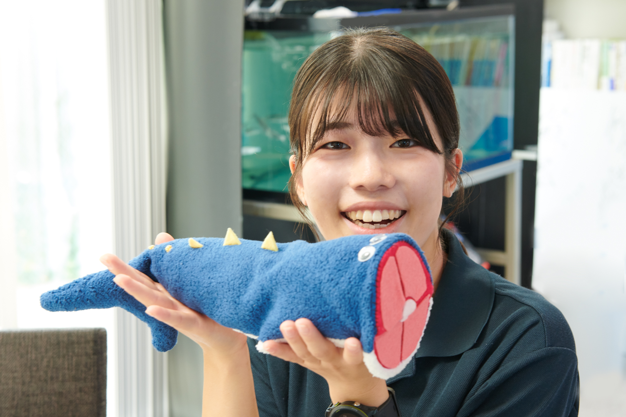 と有泉さん。見せてくれたのは、オリジナルキャラクターの“尾の身くん”の手作りのぬいぐるみ。これまで行ったお子さん向けのイベント等で、尾の身の説明をする時に大活躍しているそうです。