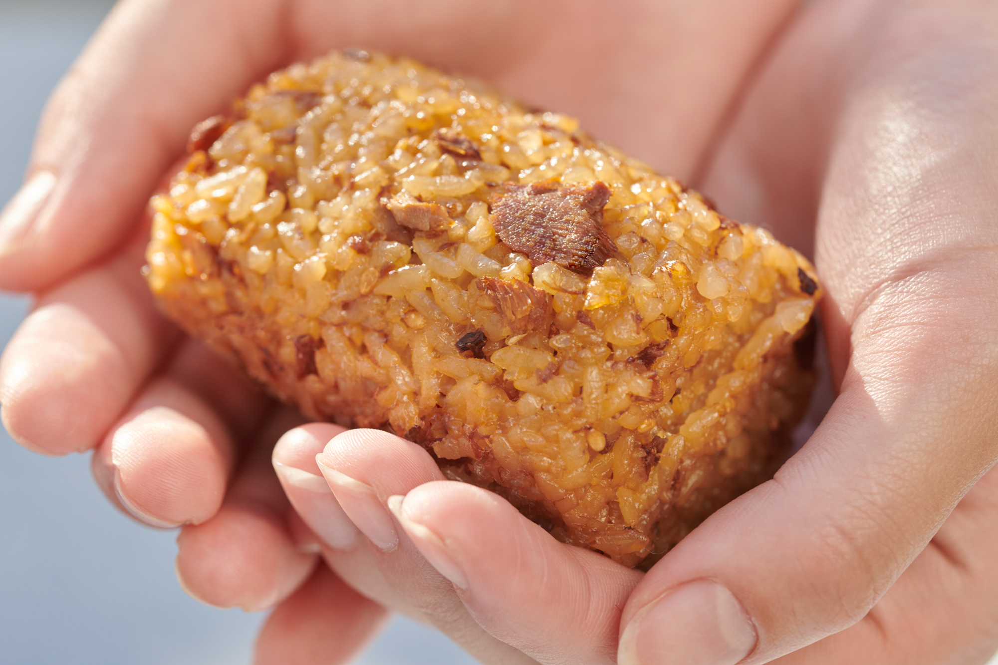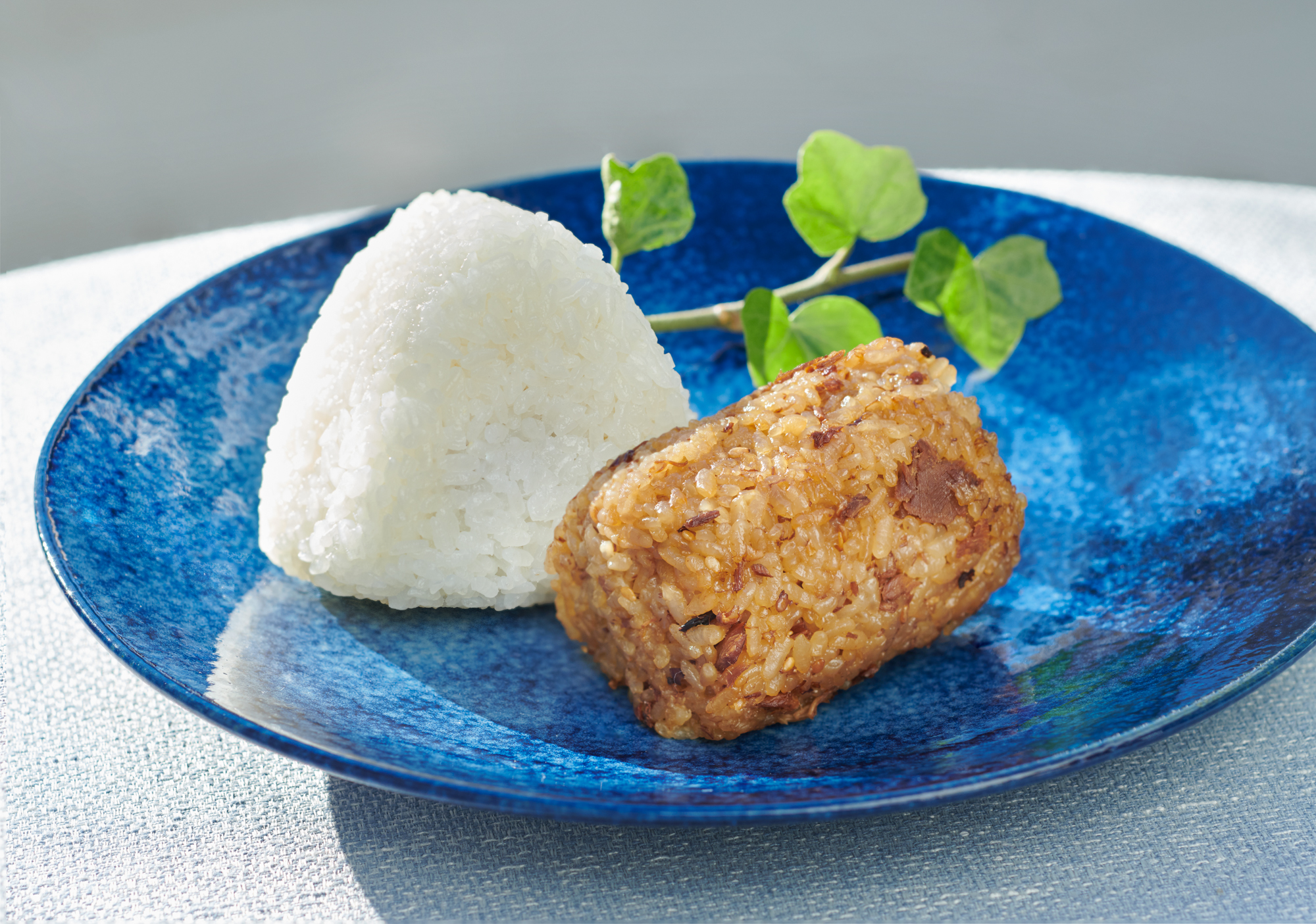 魚嫌いでも鮭のおむすびは好きなお子さんは多いからと、1つは塩鮭をイメージした塩味で。もう1つは、これも老若男女に好まれるかば焼きのたれを使って、甘めの味つけの混ぜ込みごごはん風に仕上げています。何度も試作や試食を重ね、形も、定番の三角形だけじゃなく、懐かしさを訴えたくて、1つは俵型に。大きさも少し大きめにして、お子さんが1つでお腹がいっぱいになるサイズを意識したそう。
