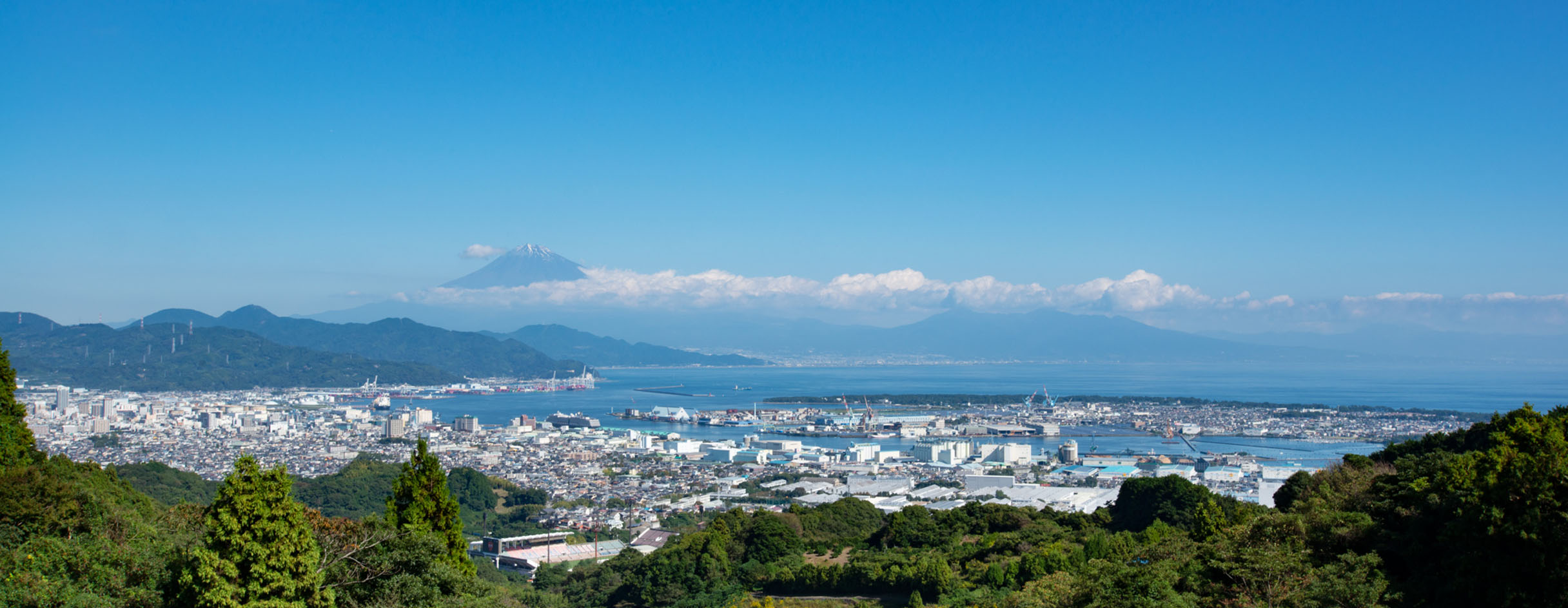 最初に訪れたのは、静岡市駿河区と清水区にかけて広がる丘陵地、日本平の山頂。ここから眼下に望む清水港は、晴れた日には正面に雄大な富士山を控え、羽衣伝説で知られる三保松原のある三保半島に抱かれる、良好な立地であることがよくわかります。