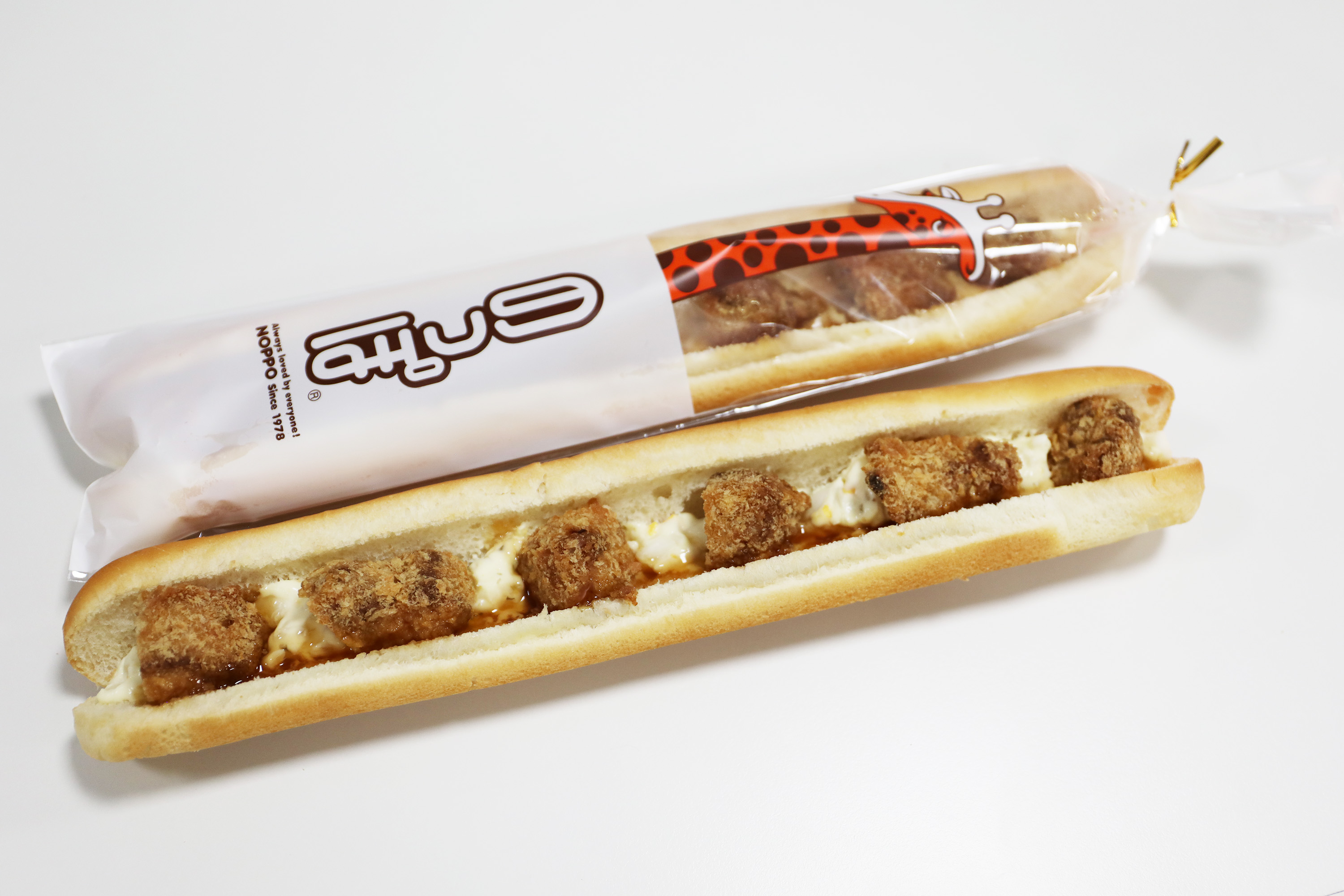 「30cm以上あるのっぽパンの長さを活かし、尾の身のカツを6個、タルタルソースと一緒に挟んでいます。2人で半分こしてもいいくらいのボリュームになりました。通常ののっぽパンのパッケージに、コラボ商品の場合、シールを貼るのですが、このシールのデザインも学生さんたちが“尾の身くん”を元にデザインしてくれたんですよ。」