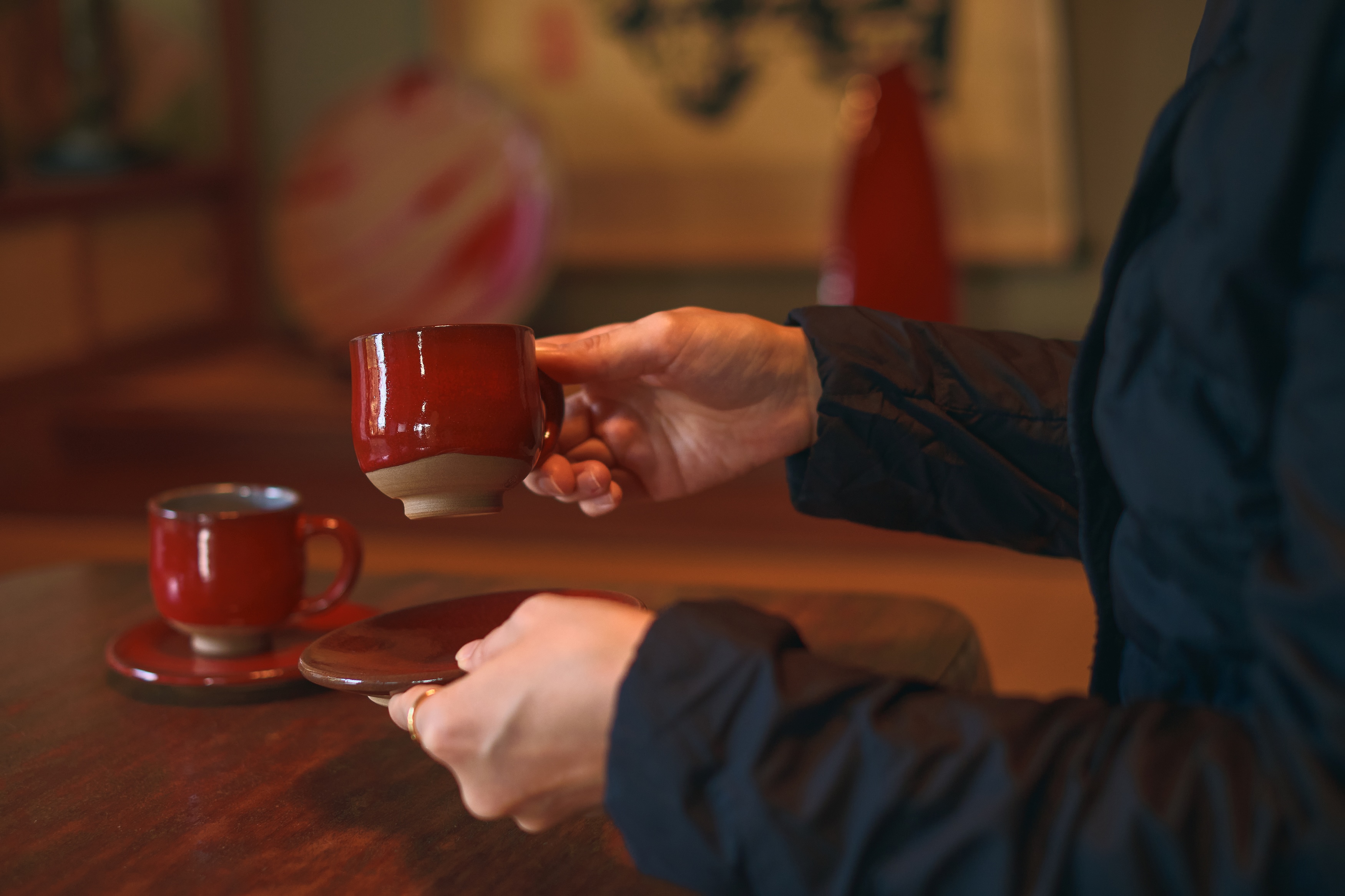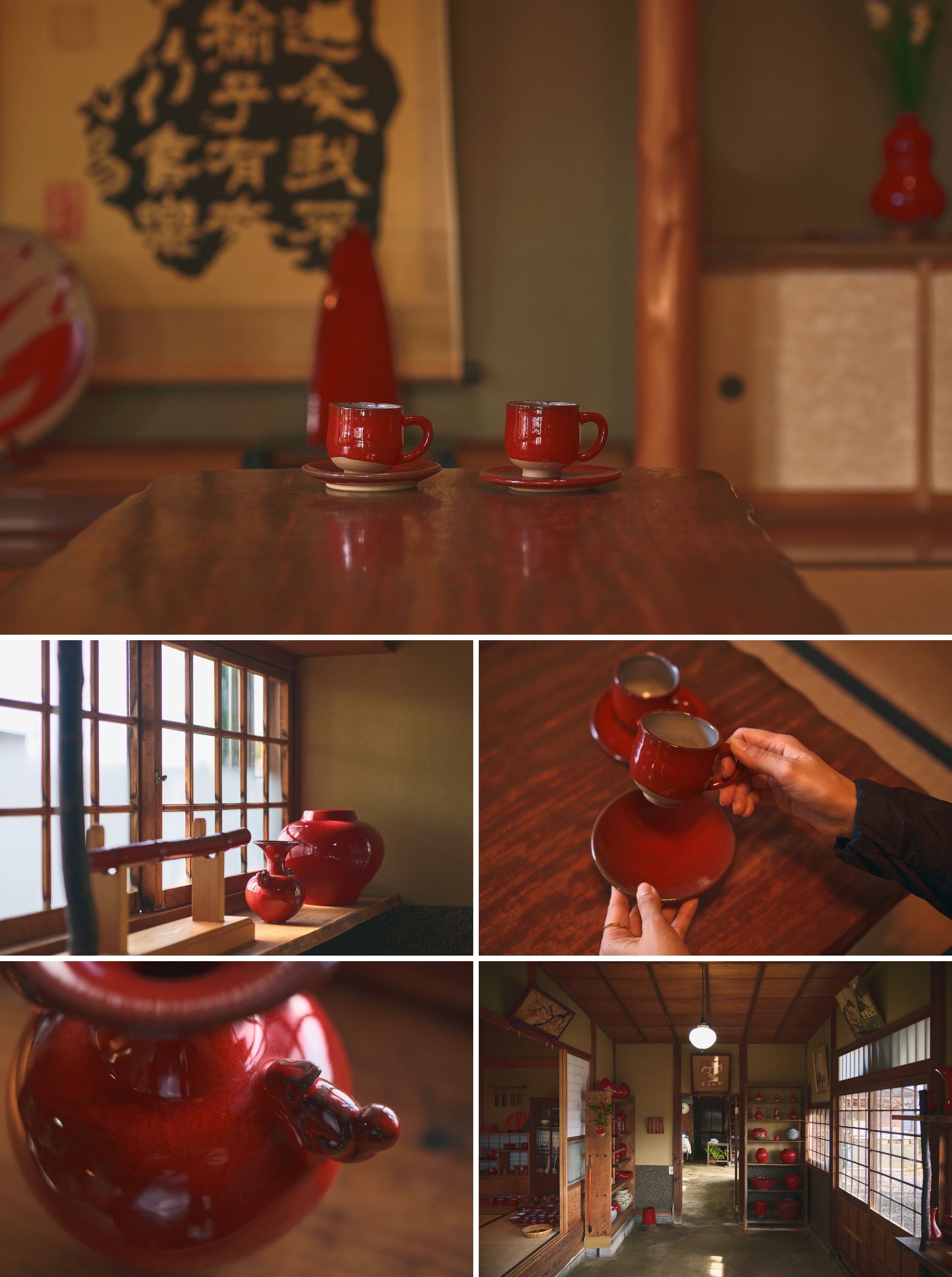 我が家にも赤焼のコーヒーカップ、茶わん、小鉢がありますが、コーヒーの黒、白米の白、青菜の緑。どんな色も不思議と映える絶妙な色味です。
