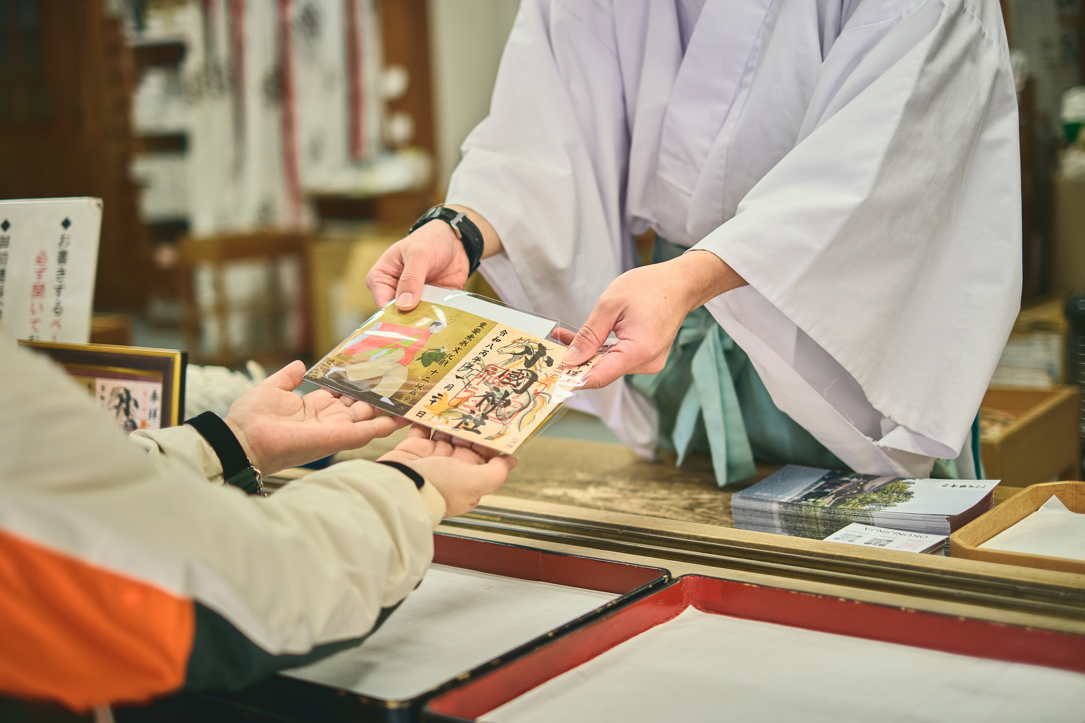 令和6年(2024年)から授与されている“十二段舞楽・十二支特別御朱印”もそのひとつ。1300年余りの歴史があり、国指定重要無形民俗文化財でもある十二段舞楽を広く周知するためにも、と始まりました。日本画家の鳥居 禮さんから小國神社へ寄贈された十二段舞楽の絵画と、神社ともご縁の深い画家の秋場美緒さん描きおろしの干支の挿絵が見開きになっています。1年毎に十二段舞楽を一段ずつ、干支の巡りと合わせて集めていく楽しみがあります。