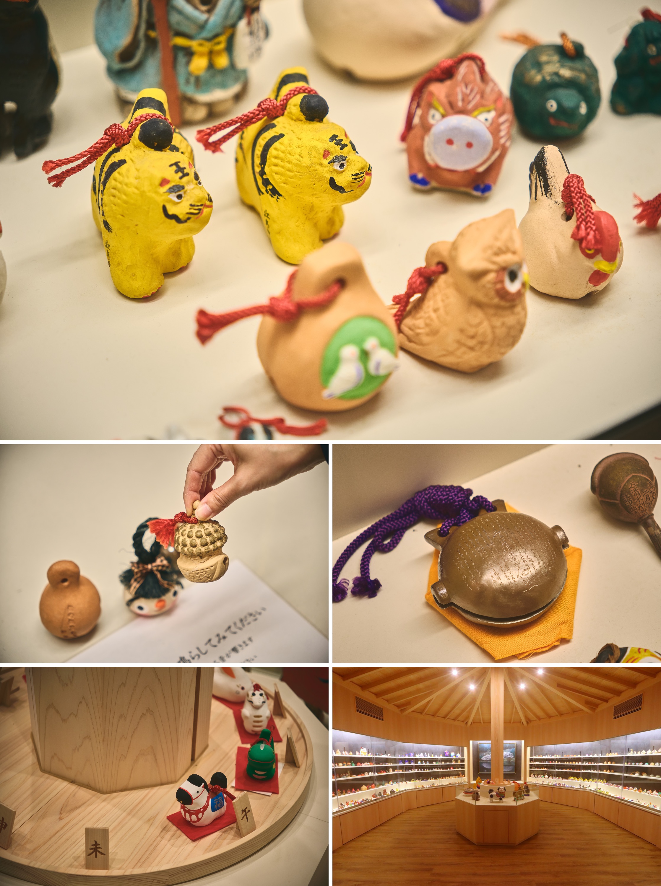 展示されているのは、まだまだほんの一部。北は北海道から南は沖縄、中には海外で制作されたものもあります。干支をかたどったもの、各地の祭事や風俗を表現したものや、大正・昭和時代のレトロな雰囲気を漂わせるもの、現代作家の手によるもの。自由な造形、美しい絵付け、細部にわたる職人の手仕事等、土鈴の世界の奥深さに驚きます。