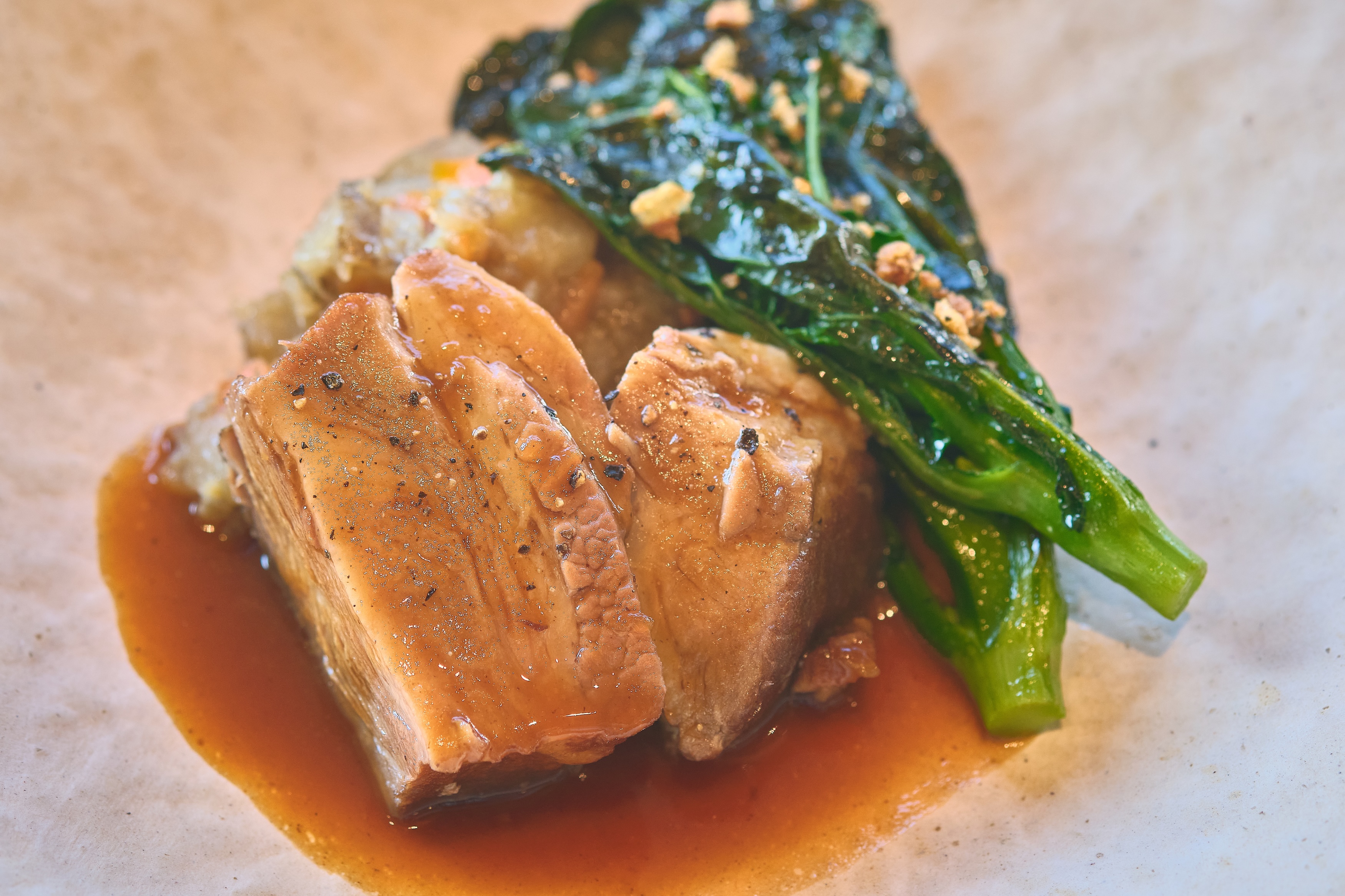 豚肉は、ナイフが要らないくらいに柔らかく、ほろっと口の中でほどけていきます。溶けていく脂身とお肉のうま味のバランスがちょうどいい!