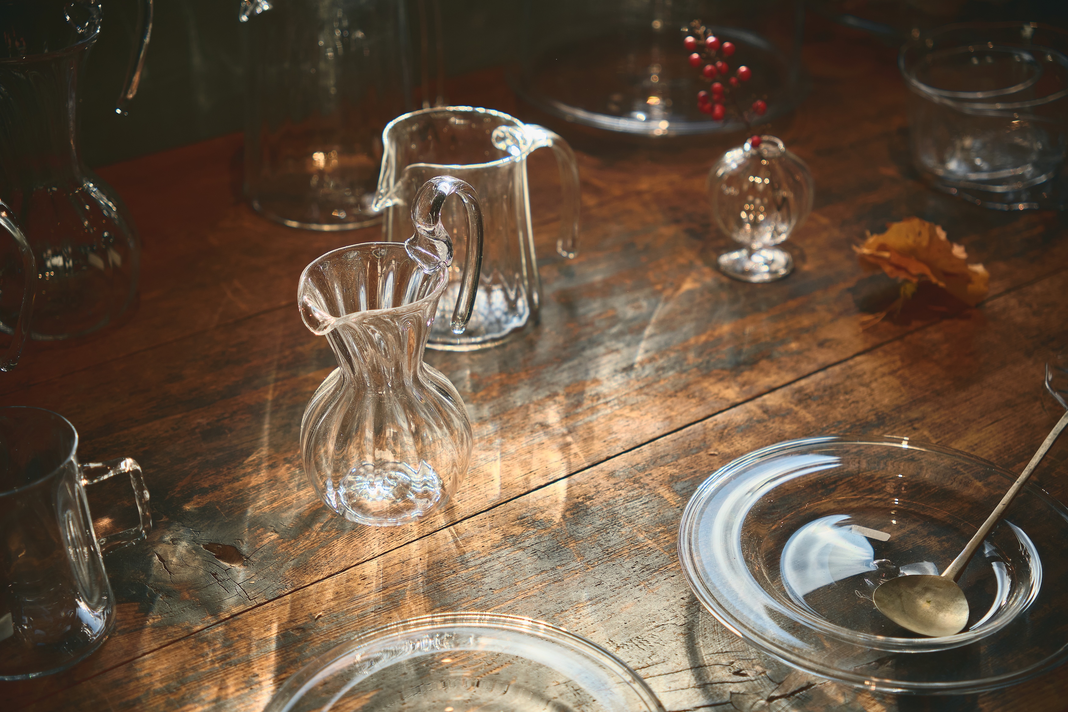 ギャラリーの扉をそっと開けると、そこに並んでいたのは数々のガラス作品。冬の淡い陽の光が差し込んでやさしく繊細な光を放っています。どれも見惚れるほどに美しく、ガラスなのに、どこか温かみも感じるような作品もあります。