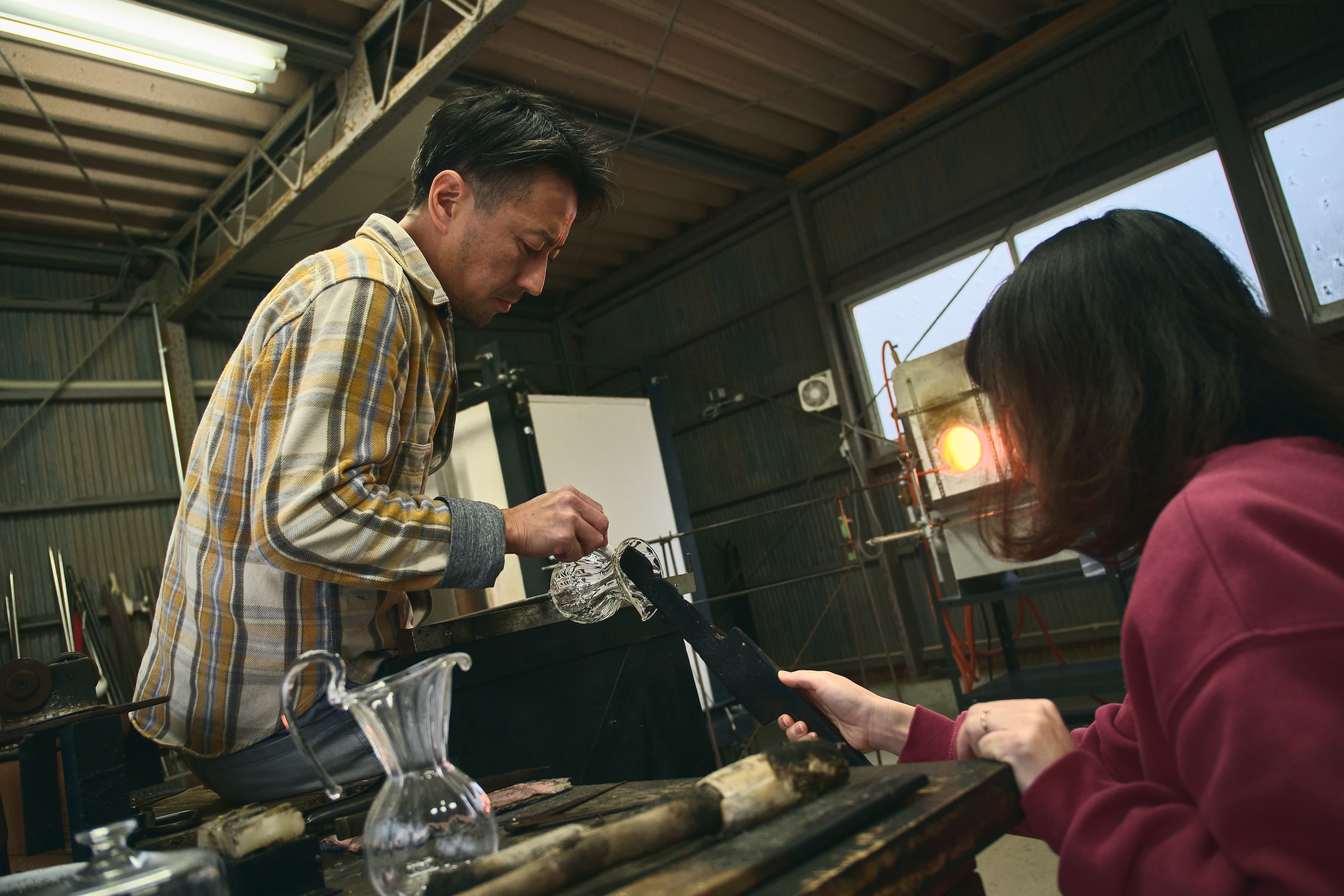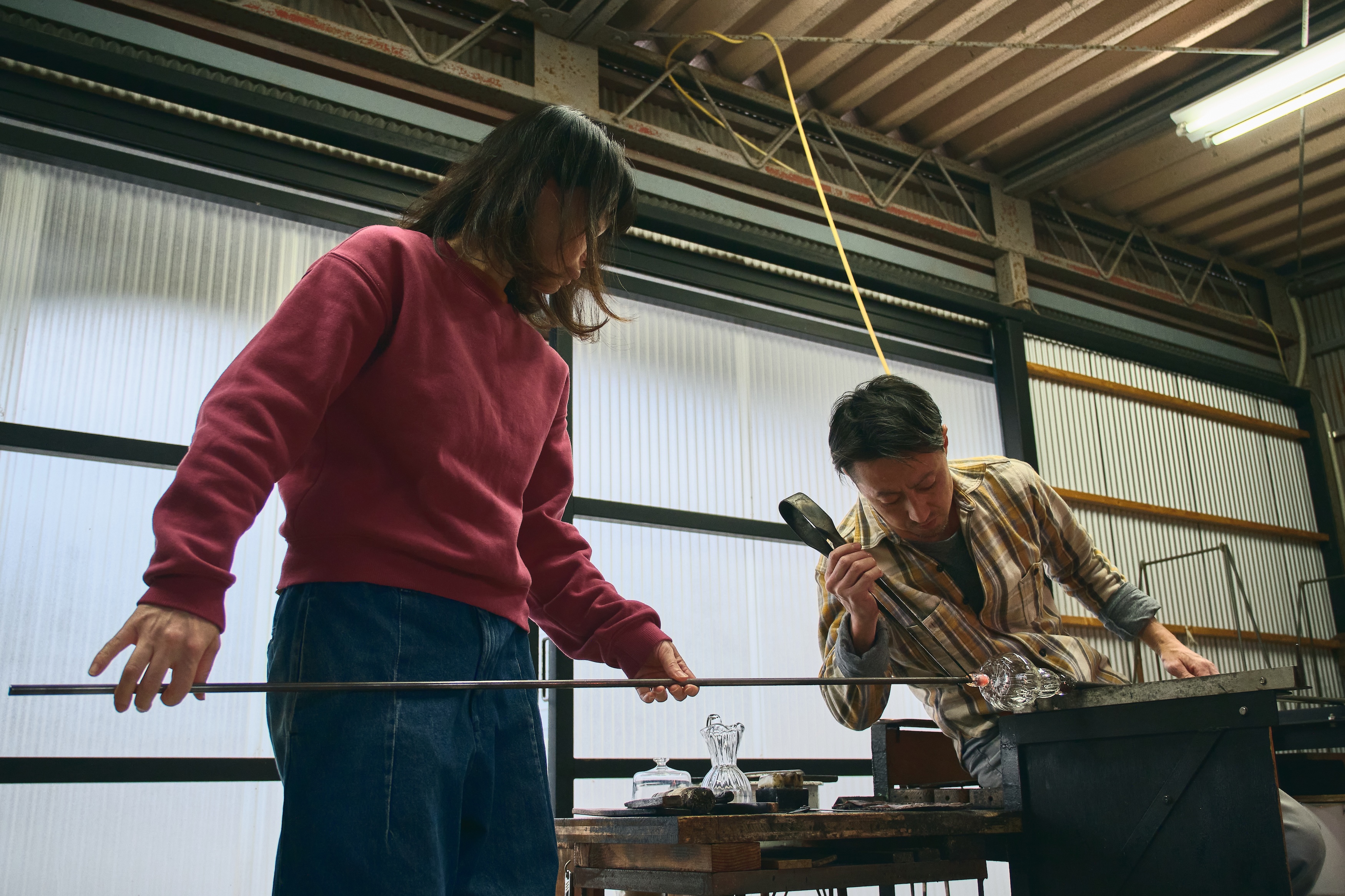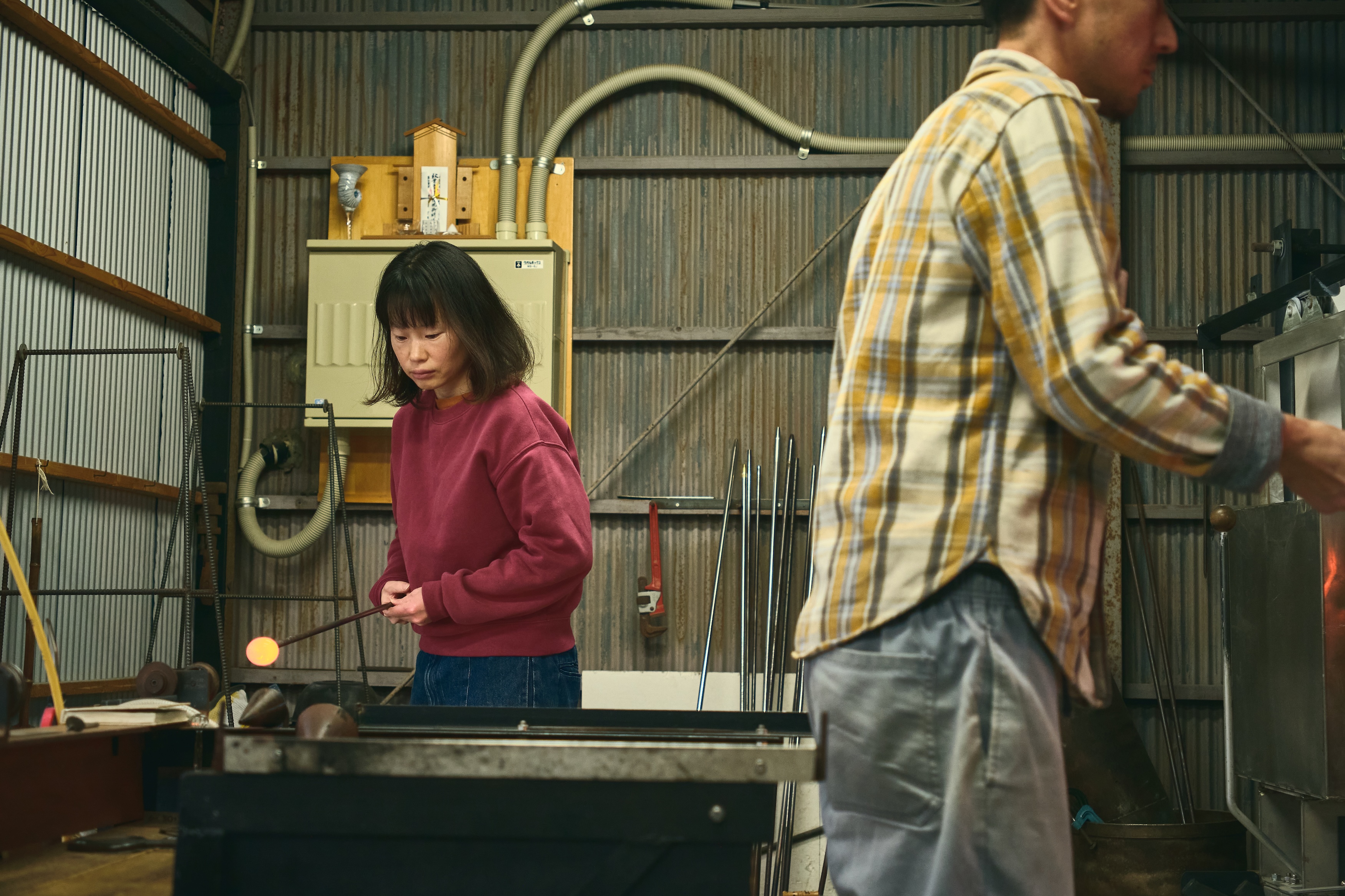 亜以さん、そのタイミングが来ると何も言わずに竿をもって炉に向かったり、必要な道具を持って側で待機していたり。作業をしながらも努さんの様子をチラリ、チラリと伺っています。