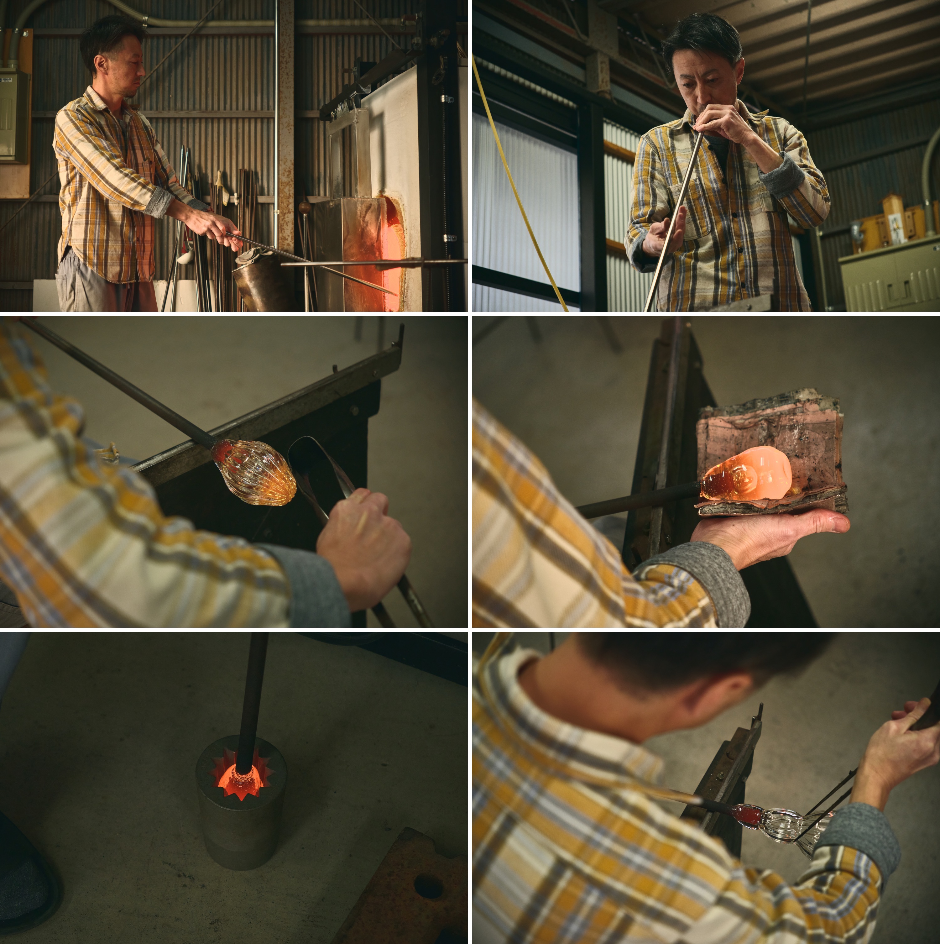 真っ赤に溶けたガラスの塊に少しずつ息を吹き込んでいく努さん。手慣れた様子ながらも、そのまなざしは鋭く真剣そのもの。窯から取り出したガラスの塊がドロドロに溶けた状態のまま、型に入れて模様をつけると、そこからまた息を吹き込んでいきます。
