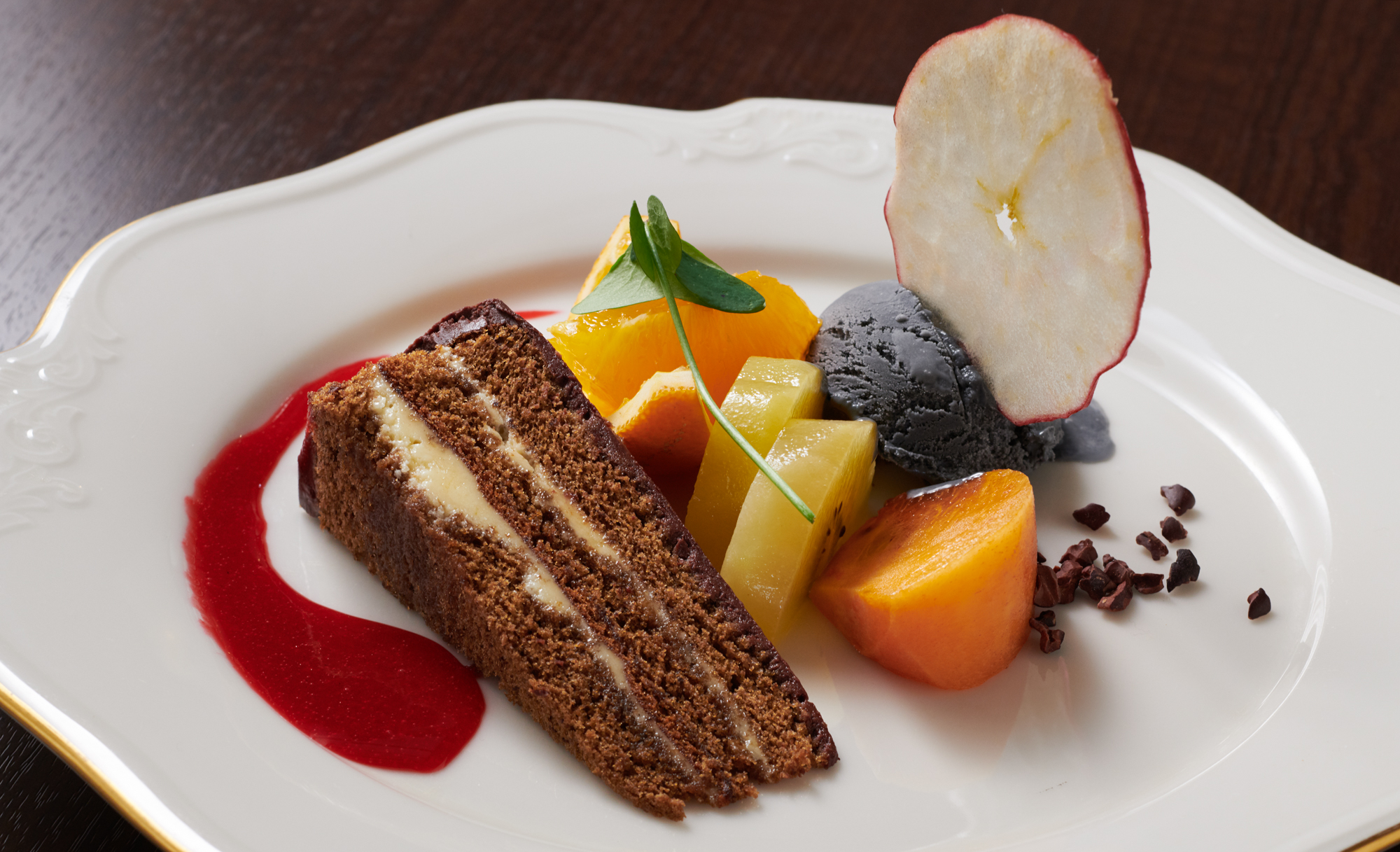 ケーキはお酒の香りが最初に来ますが、その向こうから、そこはかとなく何かしらの獣の香りがちらっとあり、これがジビエであることを思い出させます。最後に鼻に抜けていく甘い獣の香りは、確かに穴熊のものでした。竹炭のアイスの濃厚なミルクのうま味も猪だからこそだと言います。