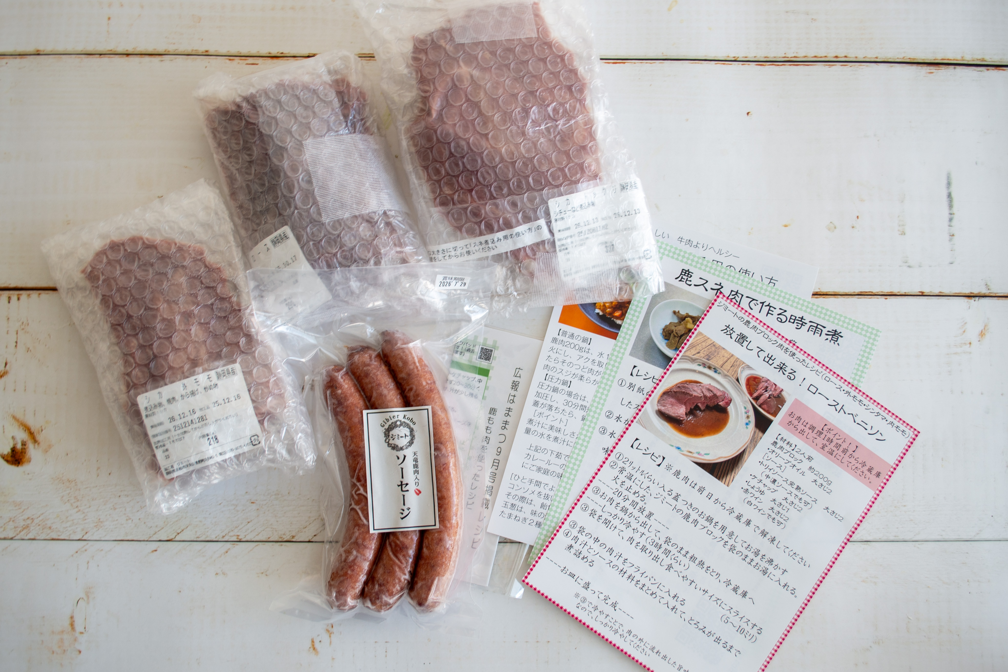 「ジミート」さんのSNSで「施設の水不足により、作業がほとんどできない状況が続いています。」という投稿を見つけました。応援セットの購入が少しでも力になればと、すぐに取り寄せてみたのですが、梱包の丁寧さにまずは感動。クール便で届いたお肉は、どれも丁寧にしっかりと梱包され、全く溶けることなくカチンコチンの状態で届いたのです。さらに、初めて調理する鹿肉ですから、自分で料理できるかなと不安に思っていましたが、それぞれの部位に合わせたレシピもついていました。
