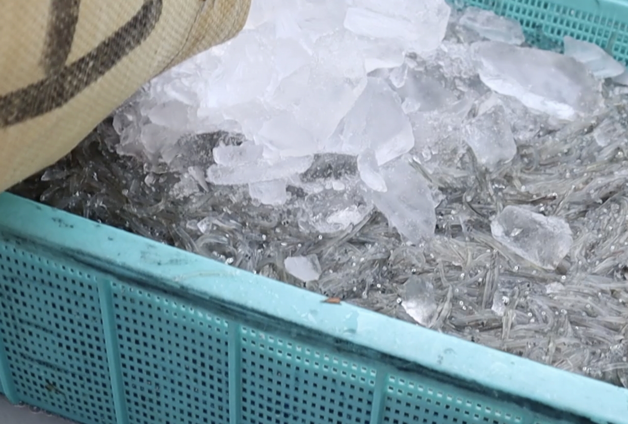 鮮度抜群のしらすは、水揚げしたら即氷締め。網を通過したしらすから次々と氷を絡ませ、新鮮さをキープします。氷締めするスピードはもちろん、氷の量によっても鮮度に影響が出てしまうほど繊細なしらす。限られた時間のなか、最大限気を張りながら漁に臨んでいるということでした。