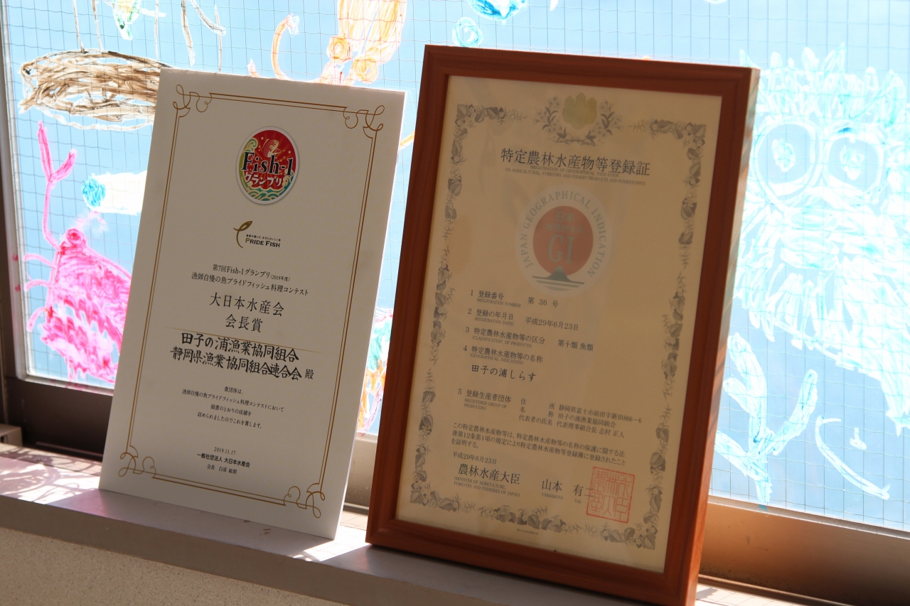 このように地理的条件と伝統漁法によって生まれた「田子の浦しらす」は、2017年に農林水産省が行う「地理的表示(GI)保護制度」に登録されています。伝統的な一艘引き漁法を行っていること、形や鮮度がいい状態で水揚げされていること、網の投入から加工まで短時間で行われていることなどが評価されました。また、2021年には「田子の浦釜揚げしらす」も登録。1品目で2つ登録されているというのは、全国でも田子の浦 漁港だけだそうです。
