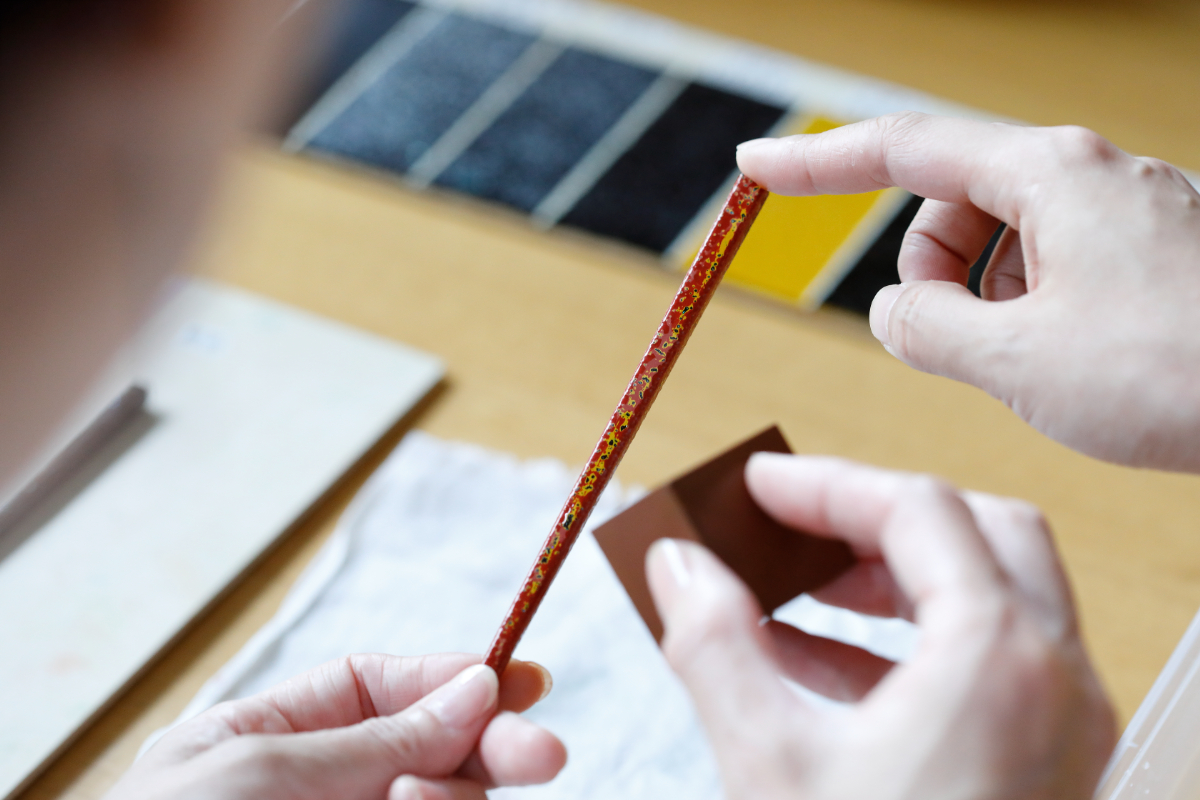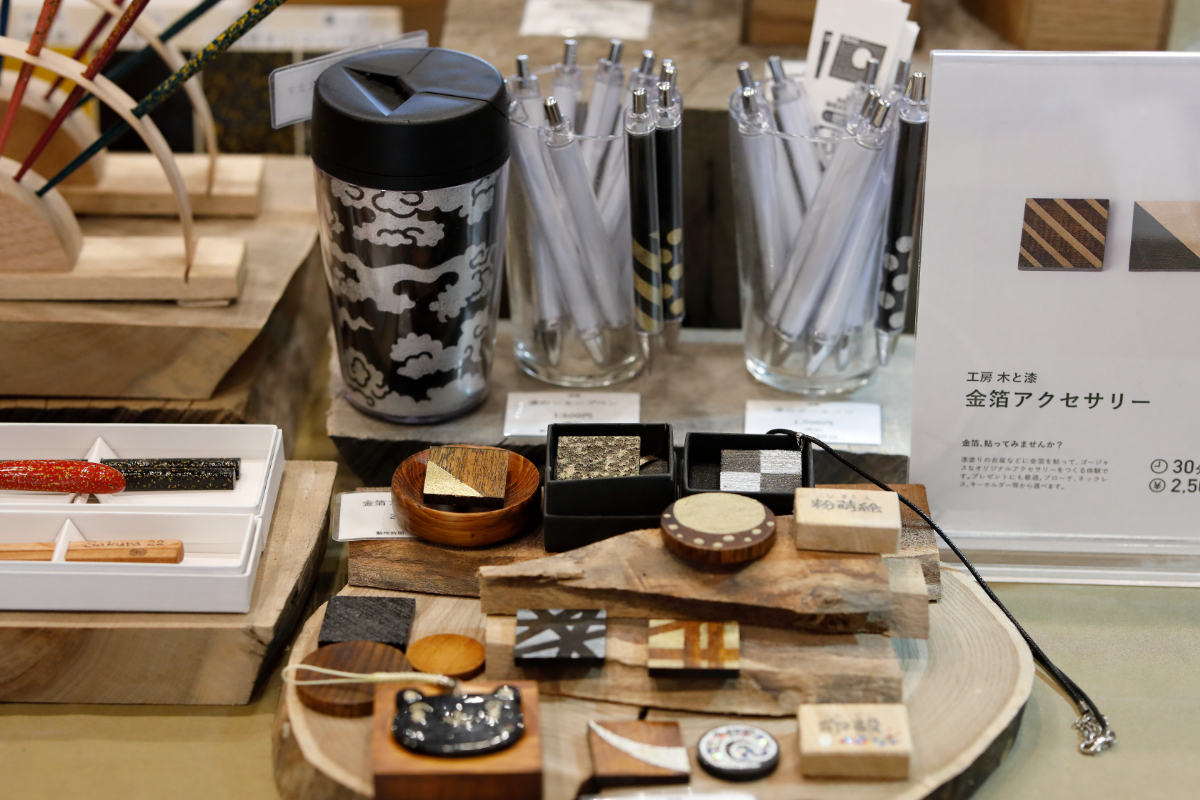 たとえば、木から箸やスプーンをつくってみたり、漆が塗られた台座に金箔を貼ってブローチなどに仕上げたり、同じく漆塗りの台座に金粉や銀粉を蒔いて蒔絵の技法を用いたタンブラーをつくったり。