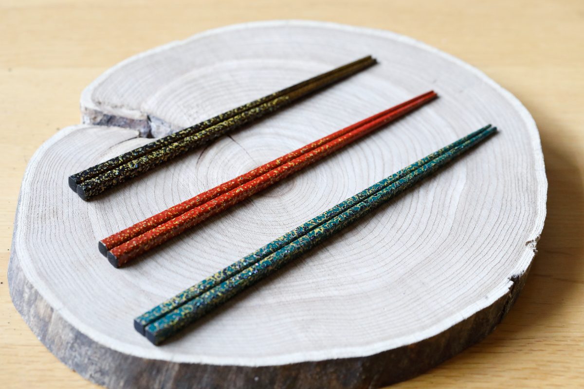 たとえば、今回、伝統工芸の技を体験する写真の箸ですが、木工職人が箸をつくった後、木肌調整(ヤスリがけ)→木固め(生漆)→研磨(ヤスリがけ)→下塗り(呂色漆)→研磨(ヤスリがけ)→呂色漆塗り後、貝蒔き→貝払い→貝固め(呂色漆)→中塗り(黄色漆)→上塗り(各色)→研磨(砥石研ぎ)→艶仕上げ(コンパウンド)といった、多くの工程が施されています。