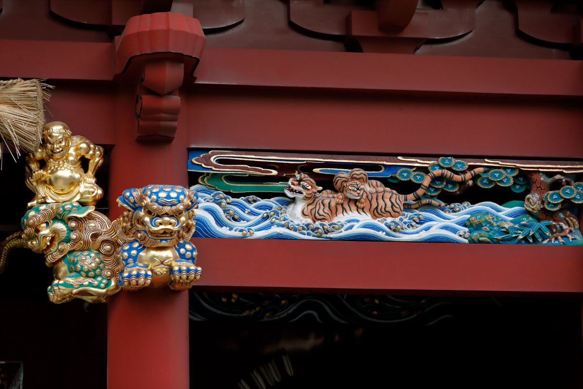 漆塗りの器はその貴重さと手間ゆえにとても高価なものです。総漆塗極彩色というのは、彫刻の上に漆を塗り、そこに金箔を押してから彩色していくとても手もお金もかかる手法で、そんな高価な漆塗りを社殿に使用するわけですから、相当な贅沢であることがわかります。